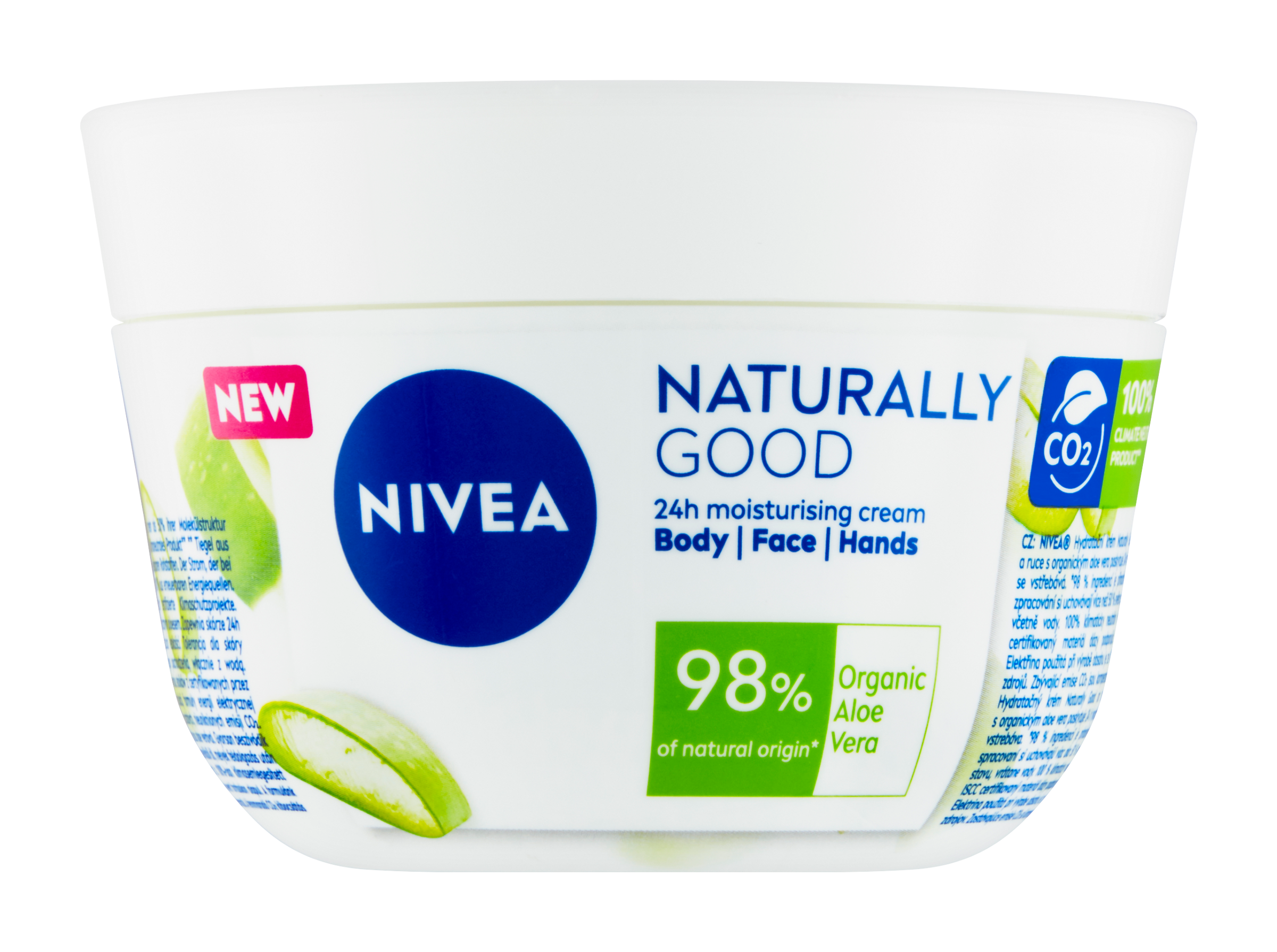 Nivea® Hydratační krém Naturally Good na tvář, tělo a ruce s organickým aloe vera poskytuje 24h hydrataci a rychle se vstřebává. 98 % ingrediencí je přírodního původu a po zpracování si uchovávají více než 50 % svého přirozeného stavu, včetně vody. 100% klimaticky neutrální výrobek = ISCC certifikovaný materiál dózy podporující smíšené zdroje. Elektřina použitá při výrobě obsahu je ze 100% obnovitelných zdrojů. Zbývající emise CO₂ jsou kompenzovány.