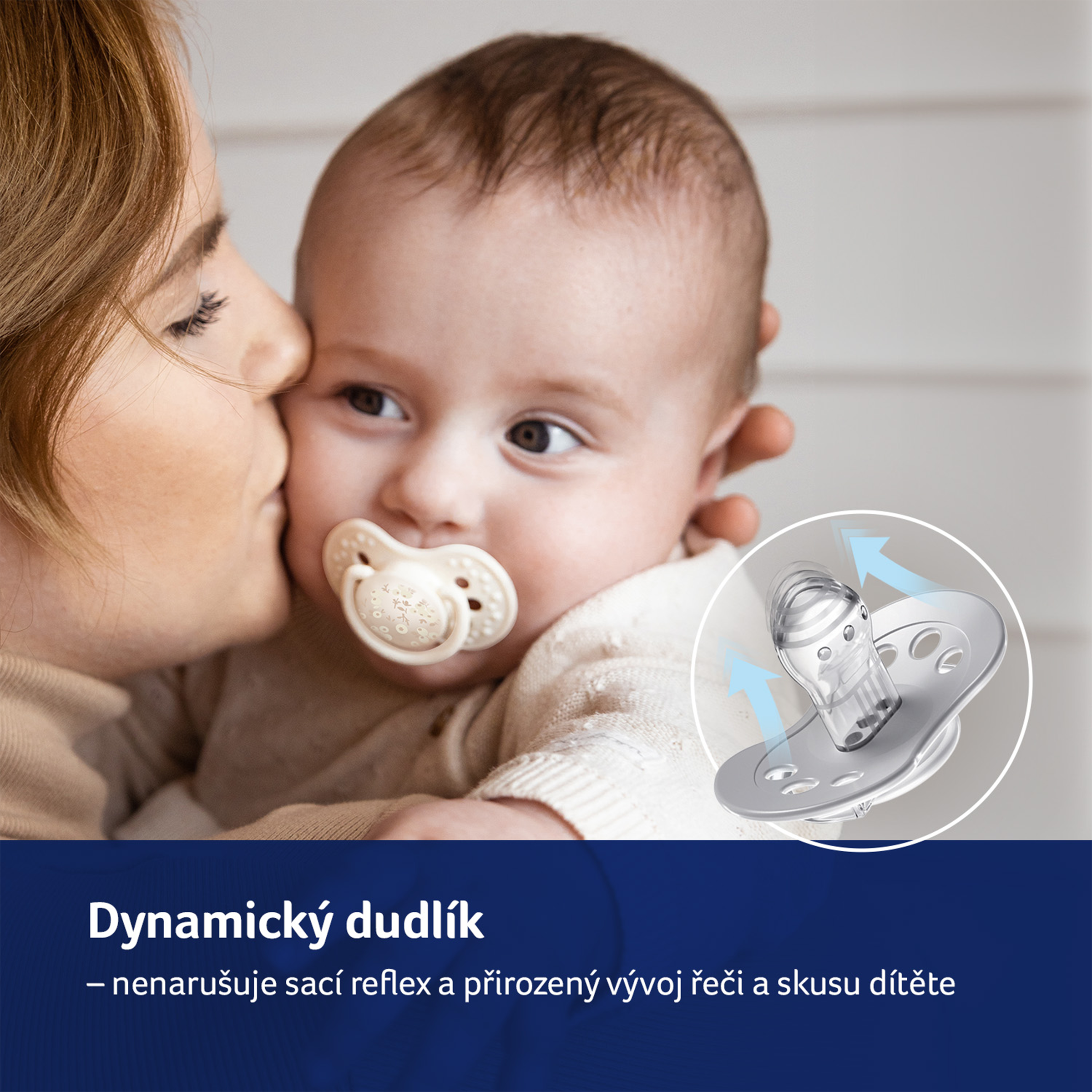Důležité pro zdraví a bezpečnost vašeho dítěte! Před každým podáním dítěti zkontrolujte kvalitu dudlíku. Věnujte dudlíku zvýšenou pozornost poté, co dítěti vyrostou první zoubky. Vyzkoušejte kvalitu špičky důkladným natažením všemi směry. Při prvních známkách poškození dudlík ihned vyhoďte a již dále nepoužívejte. Používejte pouze takové držáky dudlíků, které odpovídají požadavkům normy EN12586. Nikdy nepřipevňujte dudlík na různé šňůrky, tkaničky či stužky oděvu. Dítě se může zadusit. Nenechávejte dudlík na přímém slunečním světle, v blízkosti tepelného zdroje nebo v dezinfekčních prostředcích déle, než je doporučováno - můžete způsobit oslabení špičky dudlíku.