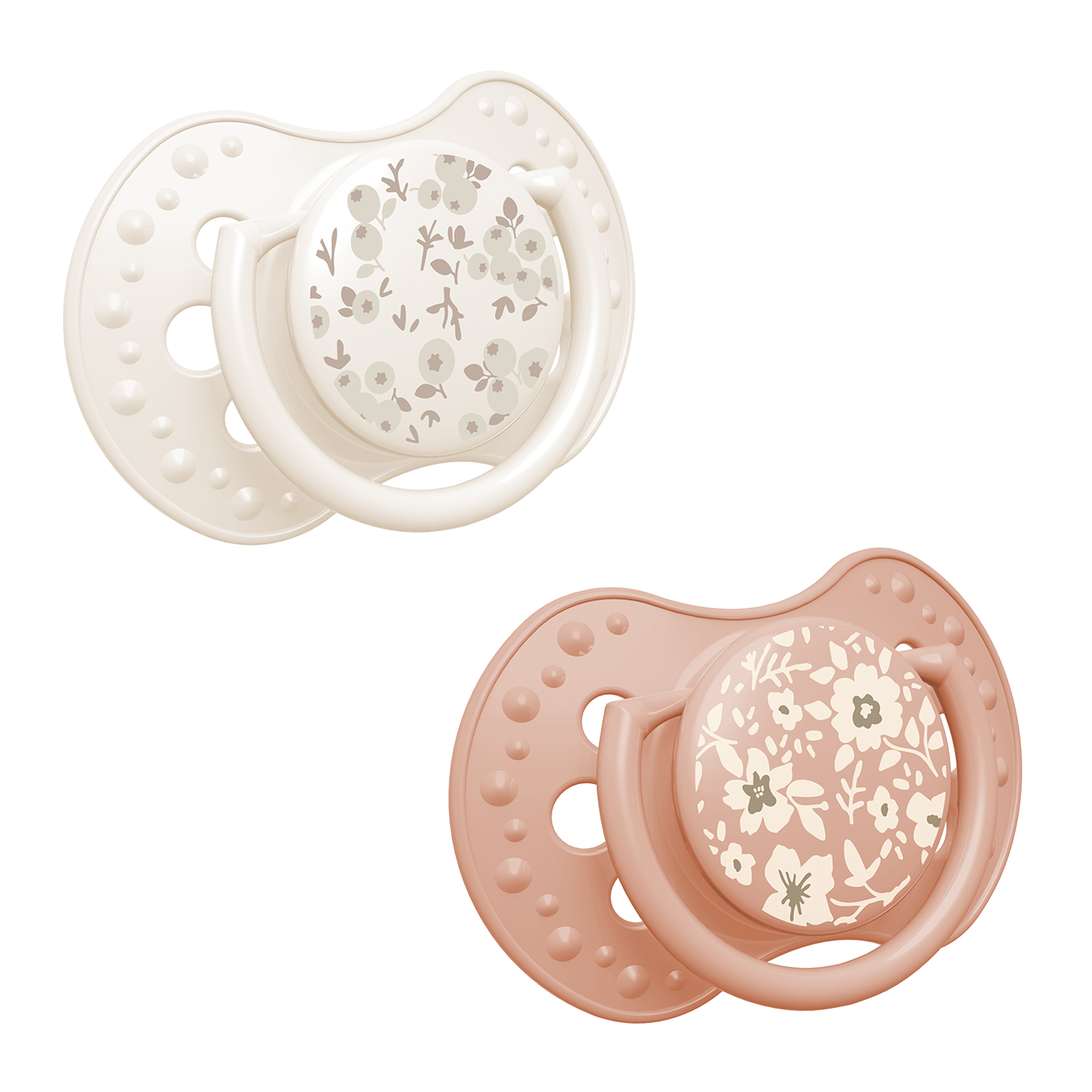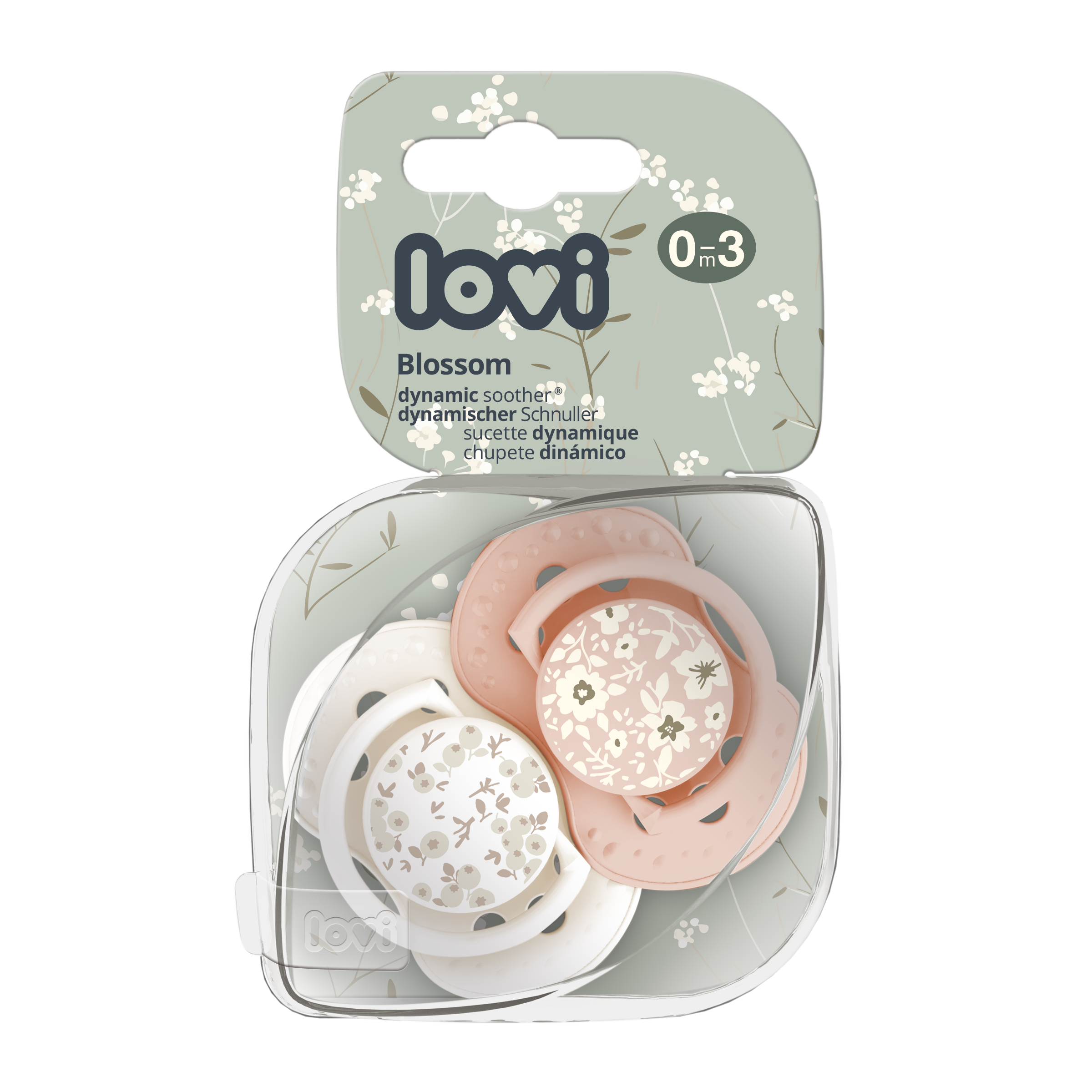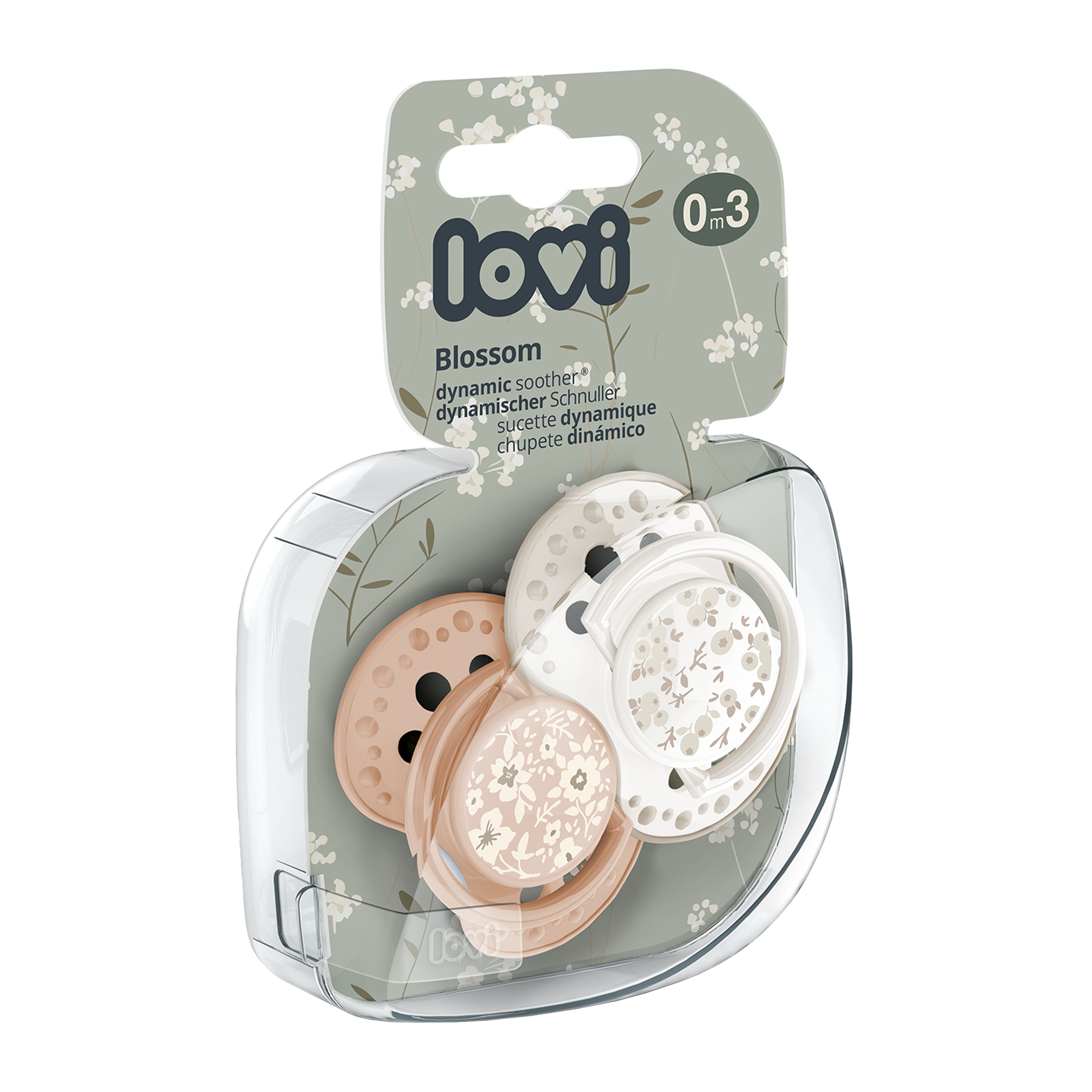 Dynamický silikonový dudlík LOVI BLOSSOM nenarušuje sací reflex miminka, je velmi lehký a dítě se při sání nenamáhá. Vhodné pro děti od 0-3m. Dynamický dudlík LOVI nenarušuje sací reflex miminka, vývoj řeči a skusu při dodržení dalších ortondotických a nerologopedických doporučení. Dudlík je velmi lehký, dítě se při sání nenamáhá. Tvar silikonové špičky je přizpůsoben přirozenému sacímu reflexu, silikonová část je úzká na začátku u štítku a rozšířená na konci tak, aby se špička natahovala a stahovala podle rytmu sání dítěte. Díky tomu je chráněn sací reflex miminek a sání dudlíku nemá nepříznivý vliv na kojení. Symetrický tvar špičky vychází z tvaru maminčiny bradavky naplněné mlékem, která poskytuje miminku důvěrně známý pocit podobný pocitu sání z prsu. Špička je zploštělá a konec dudlíku je tak tenký, že umožňuje dítěti volně zavírat ústa a správně pracovat dásněmi při sání a zároveň poskytuje dostatek prostoru v ústech pro práci jazyka, což snižuje riziko vzniku malookluze a vad řeči*.