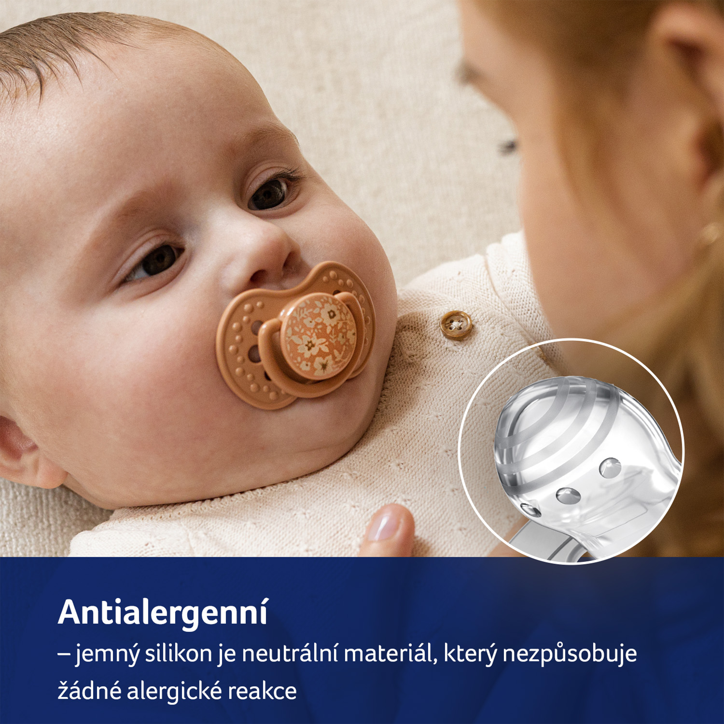 - Antialergický - jemný silikon v dudlíku je pro miminko neutrálním materiálem, nevyvolává alergické reakce, je bez chuti a zápachu, což je obzvláště důležité v této fázi, když je dítě citlivé na vnější podněty.
