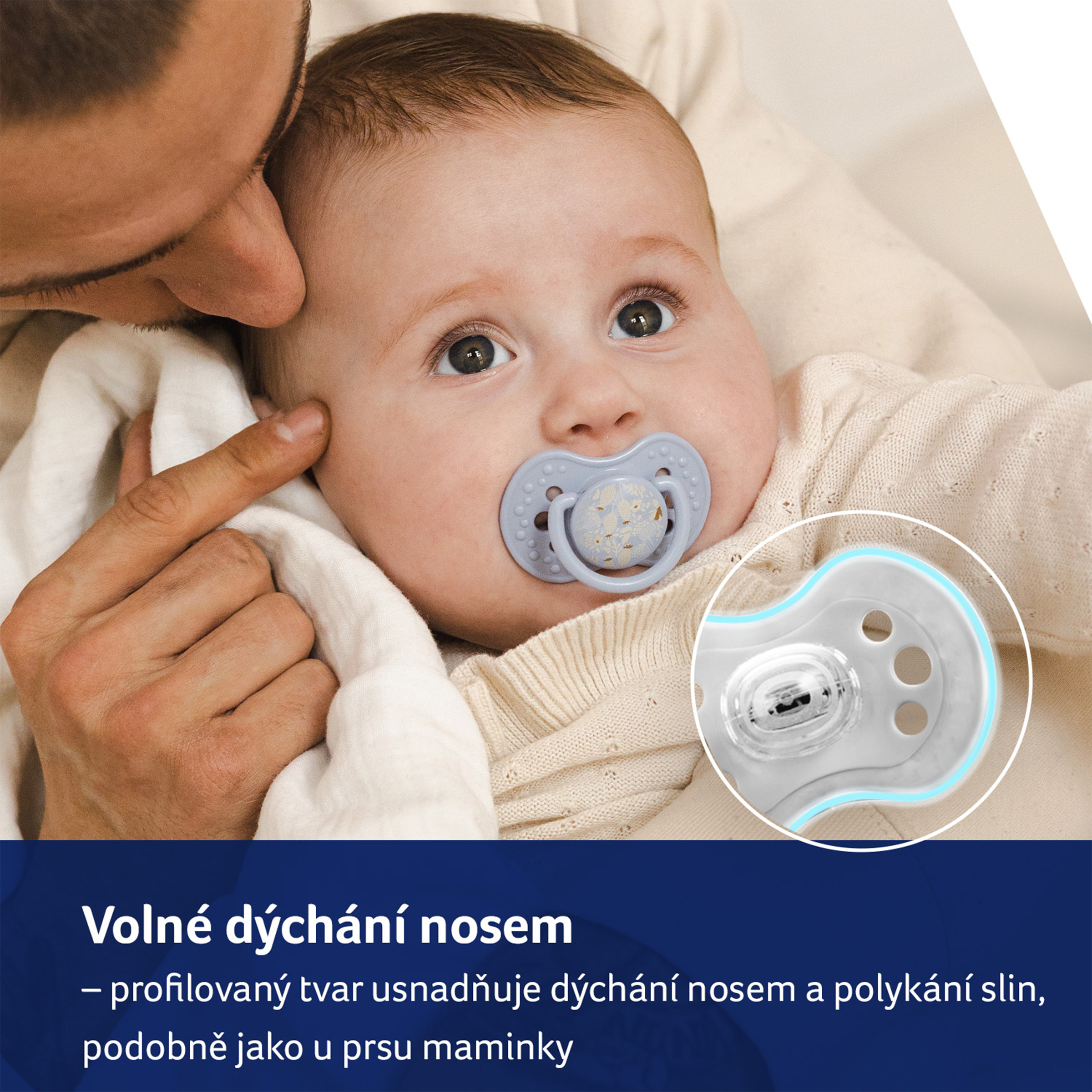 - Volné dýchání nosem - tvarovaný štítek pod nosem, který usnadňuje volné dýchání a polykání slin stejně jako u maminčina prsu.