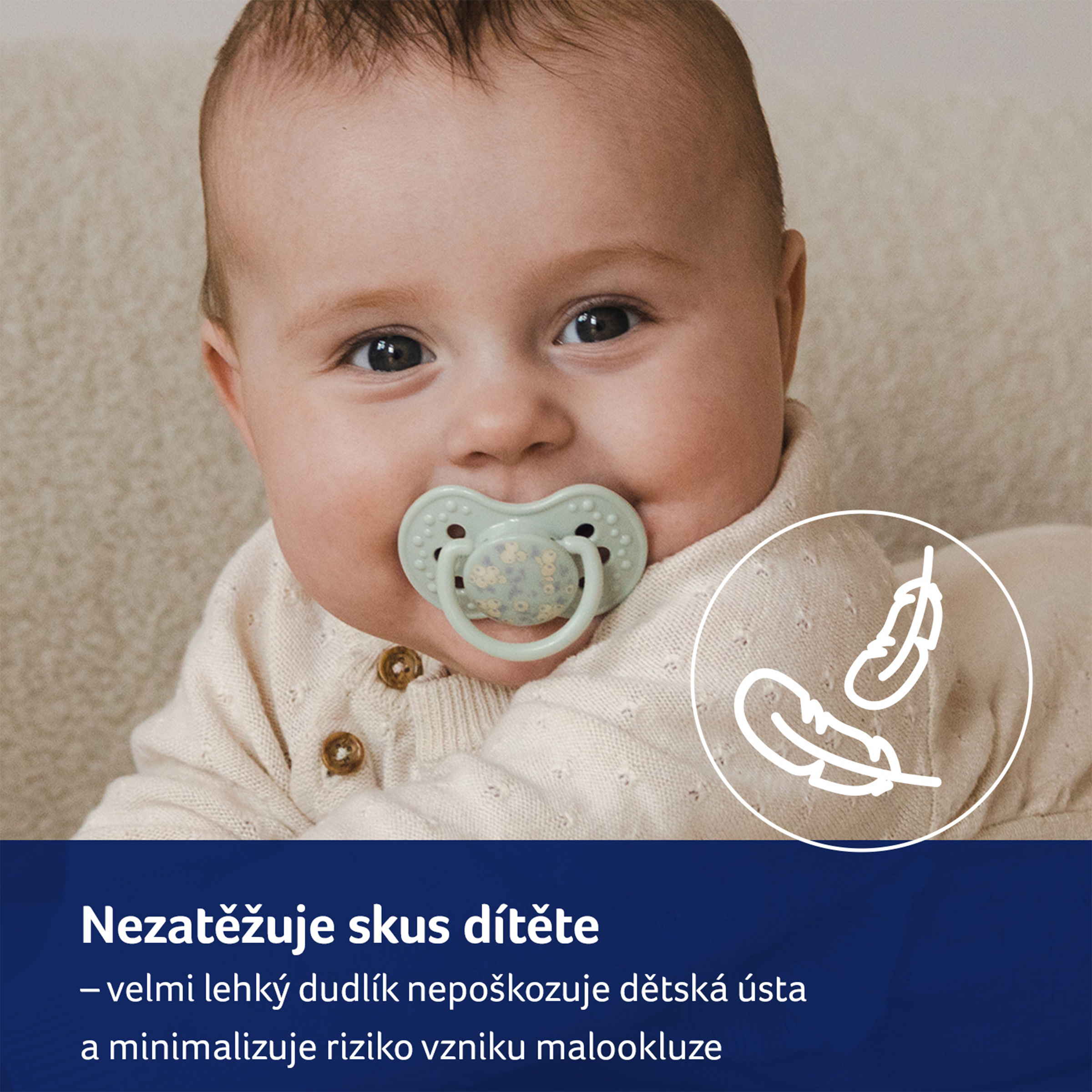 - Zabraňuje reflexu kousání dudlíku - velmi lehký dudlík, který nezatěžuje dětská ústa a minimalizuje tak riziko vzniku křivých zubů (malookluze).