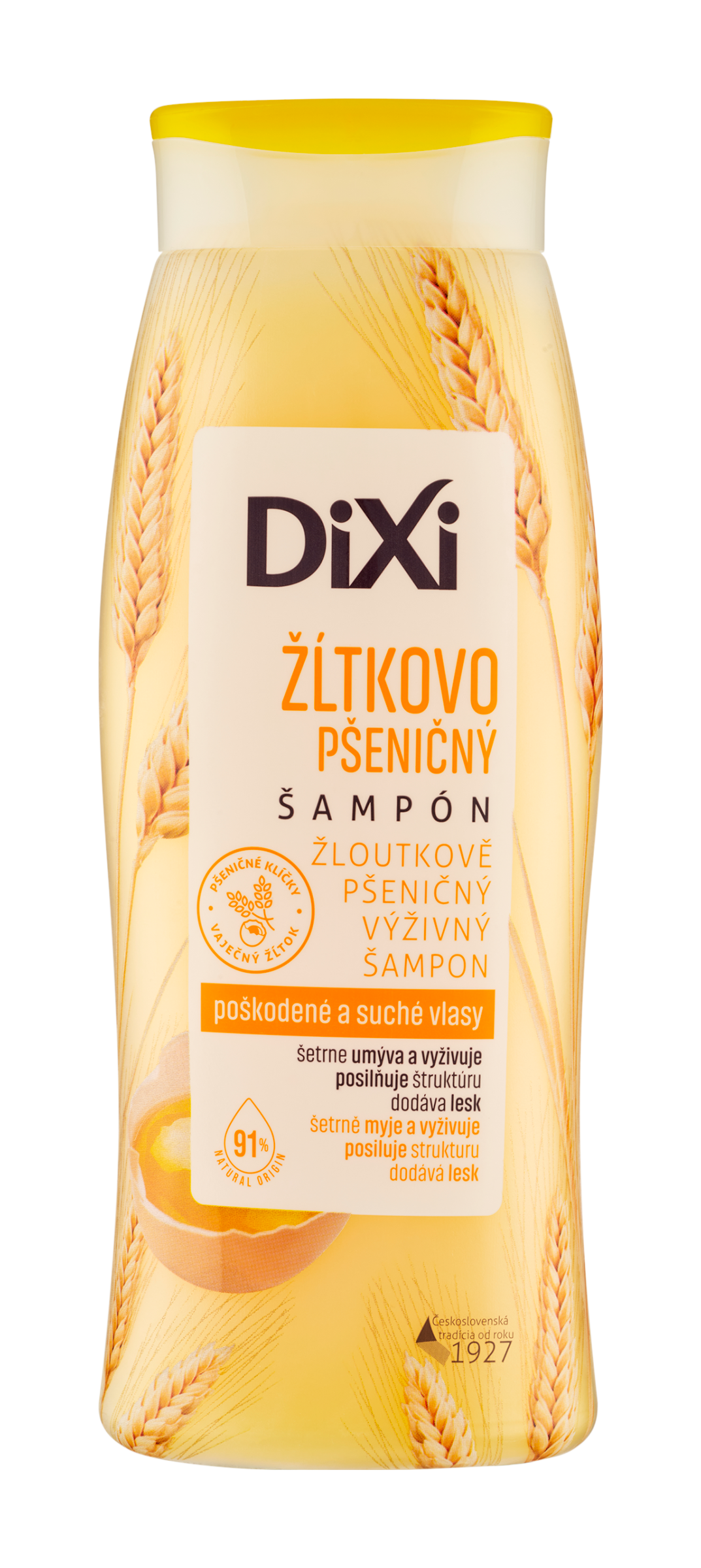 Dixi žloutkově-pšeničný výživný šampon pro poškozené, suché a namáhané vlasy. Vlasy jemně myje a napomáhá udržovat jejich zdravý vzhled. Obsahuje 91% složek přírodního původu.