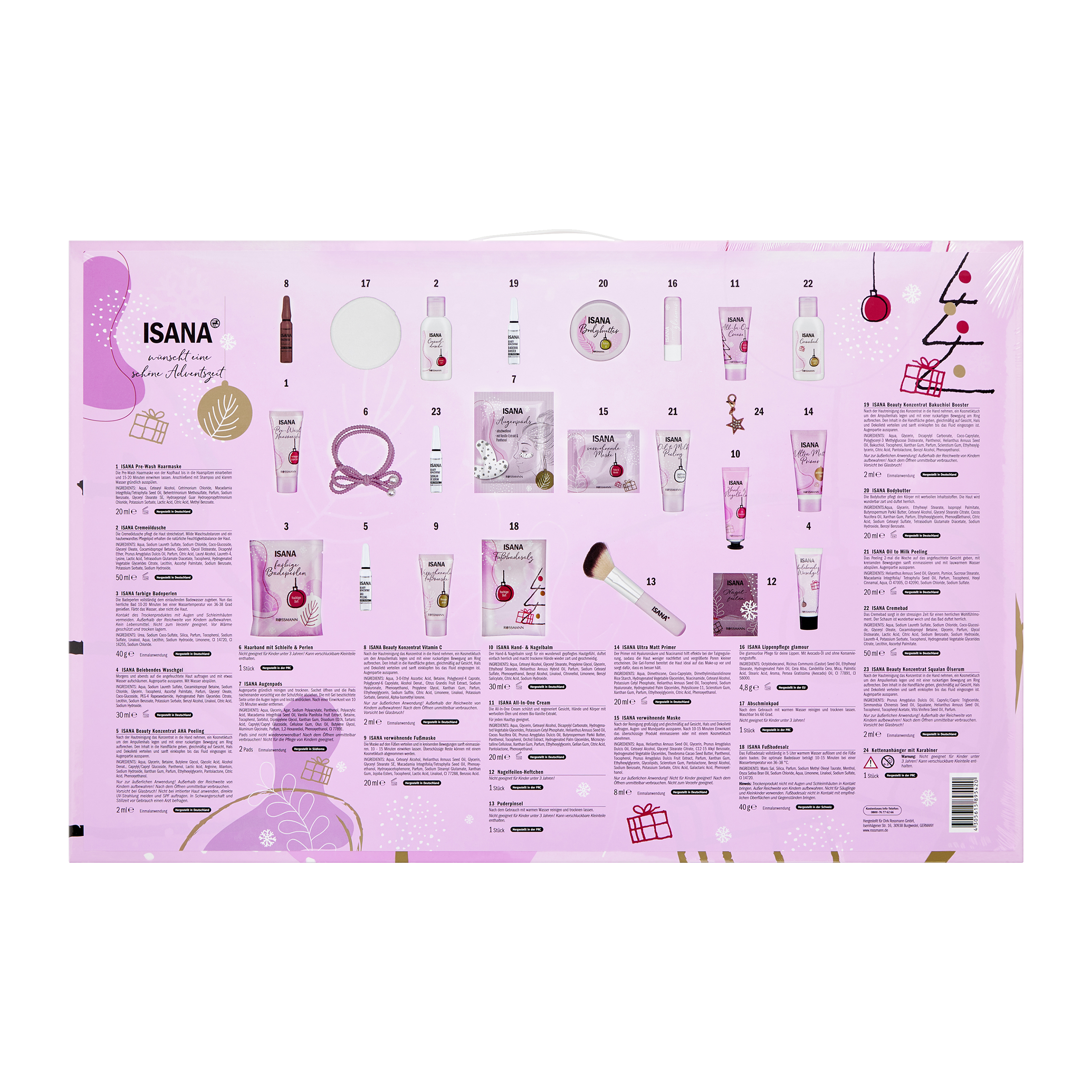 - ISANA Pre-Wash Haarmaske: Aqua, Cetearyl Alcohol, Cetrimonium Chloride, Macadamia Integrifolia/Tetraphylla Seed Oil, Behentrimonium Methosulfate, Parfum, Sodium Benzoate, Glyceryl Stearate SE, Hydroxypropyl Guar Hydroxypropyltrimonium Chloride, Potassium Sorbate, Lactic Acid, Citric Acid, Methyl Benzoate.