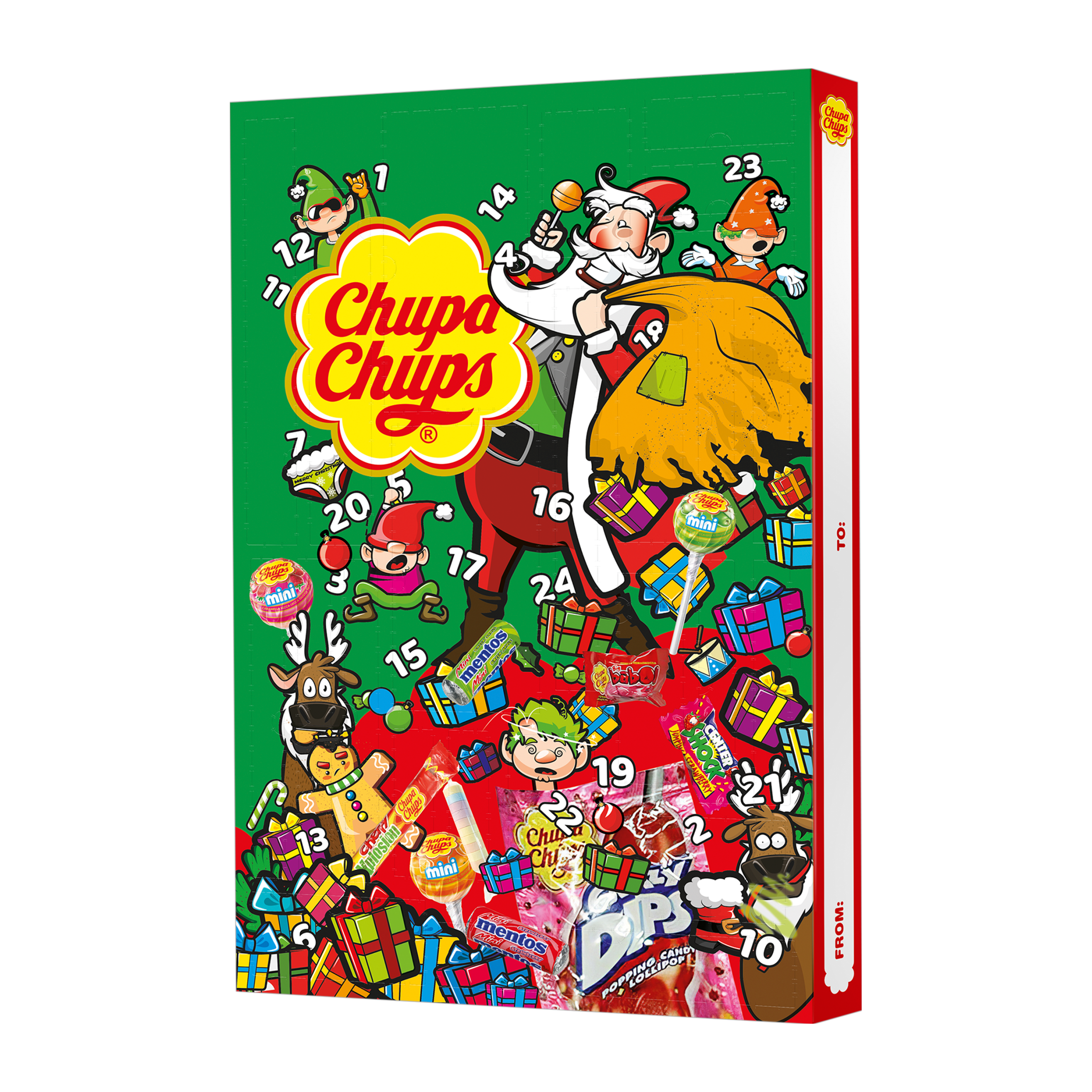Užijte si sladké vánoční momenty s adventním kalendářem Chupa Chups! Každý den na vás uvnitř čeká překvapení v podobě lízátek a žvýkaček Chupa Chups různých příchutí a velikostí.