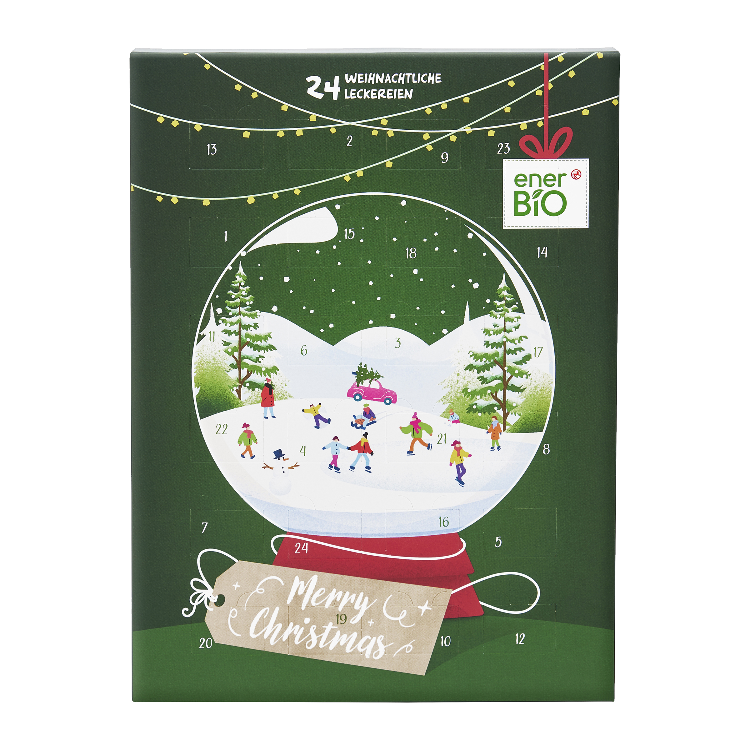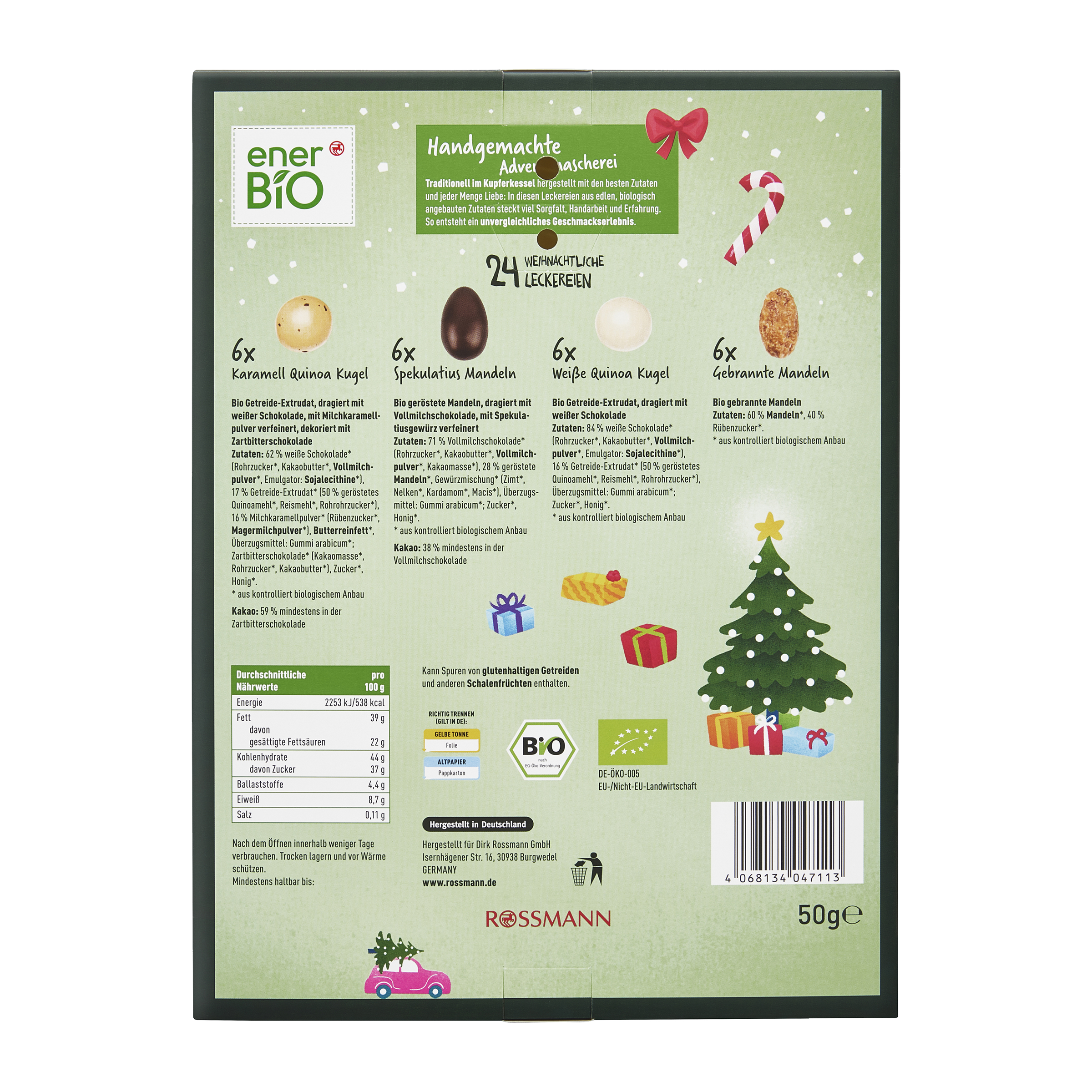 Za 24 okénky se skrývají karamelové quinoa kuličky, speculoos mandle, bílé quinoa kuličky a pražené mandle. Výroba těchto vánočních dobrot probíhá zcela bez umělých aromat nebo přísad. Všechny ingredience pocházejí z ekologického zemědělství. Těchto 24 dražé je vyráběno s láskou a tradiční ruční prací, a poskytuje tak nezapomenutelné chuťové zážitky. Adventní kalendář enerBiO s čokoládovými kuličkami je perfektním dárkem nejen pro malé, ale i pro velké mlsouny!