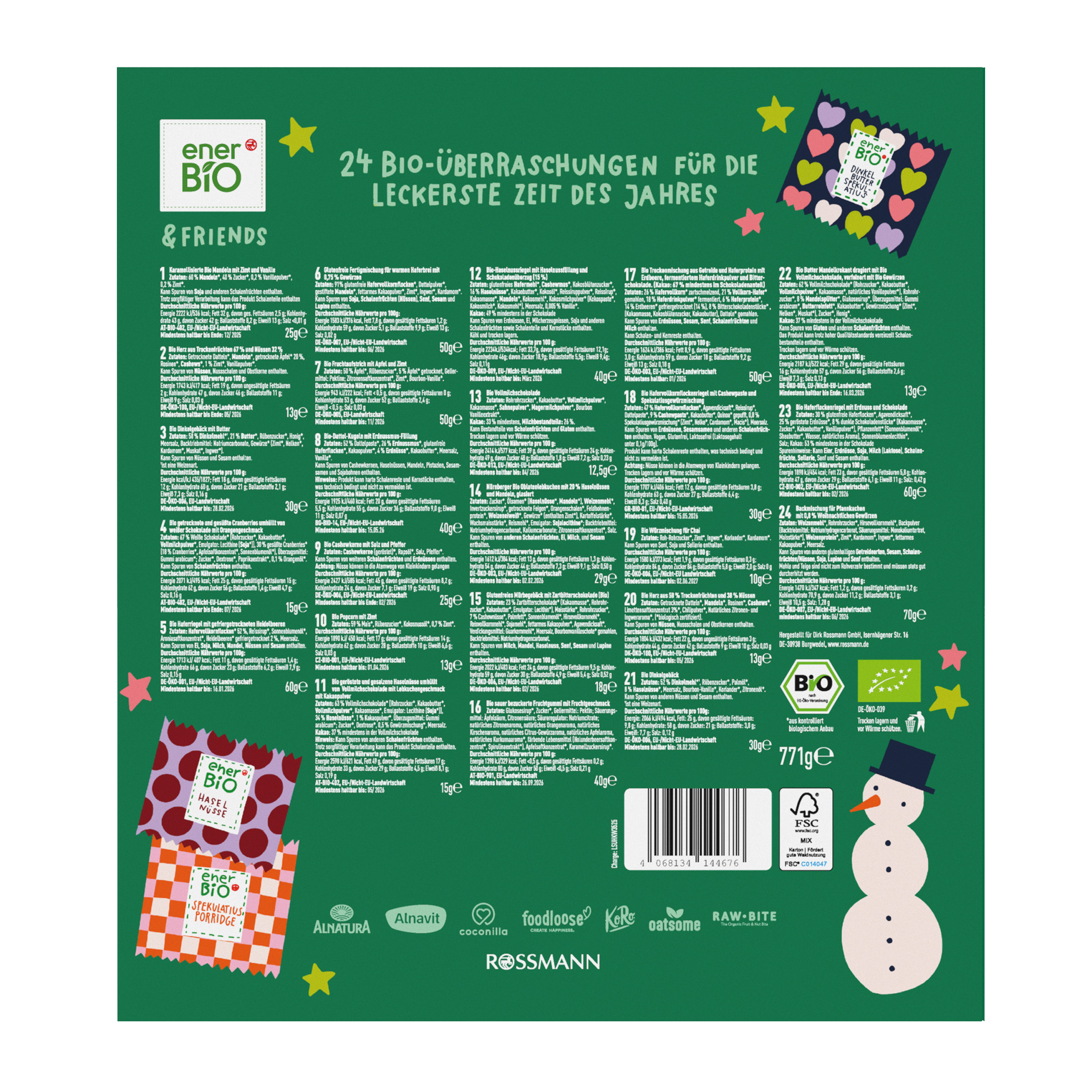 Těšte se na příjemnou cestu za poznáním: Za každými z 24 dveří se skrývá lahodný bio okamžik. Čeká na vás 16 lahůdek od naší oblíbené značky enerBiO – od speciálních ořechových specialit přes vánoční snídaňové produkty až po jemnou čokoládu. Osm dalších překvapení od oblíbených bio značek, jako jsou RawBite, KoRo, Alnatura, foodloose, Coconilla, Alnavit a oatsome, poskytuje ještě větší rozmanitost.