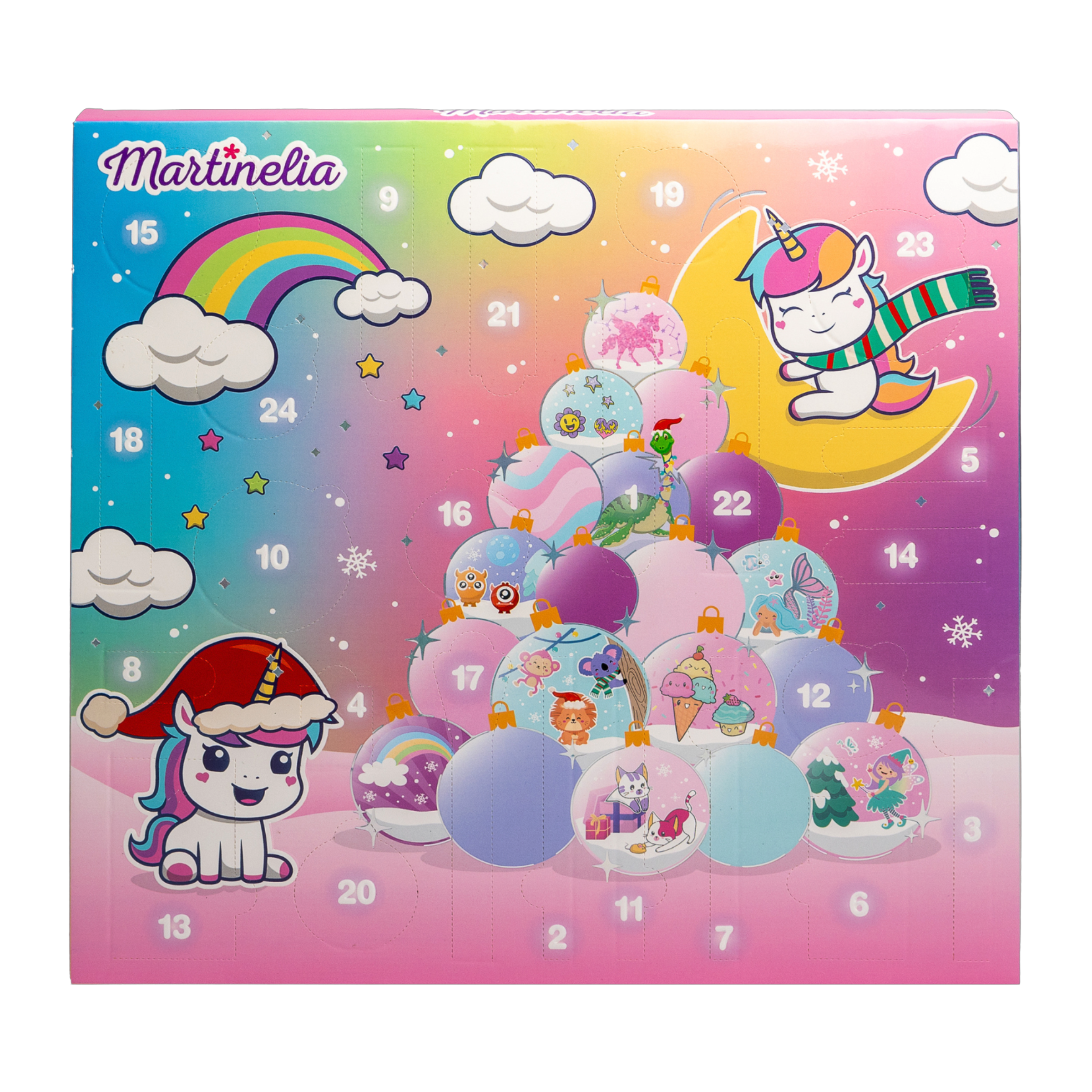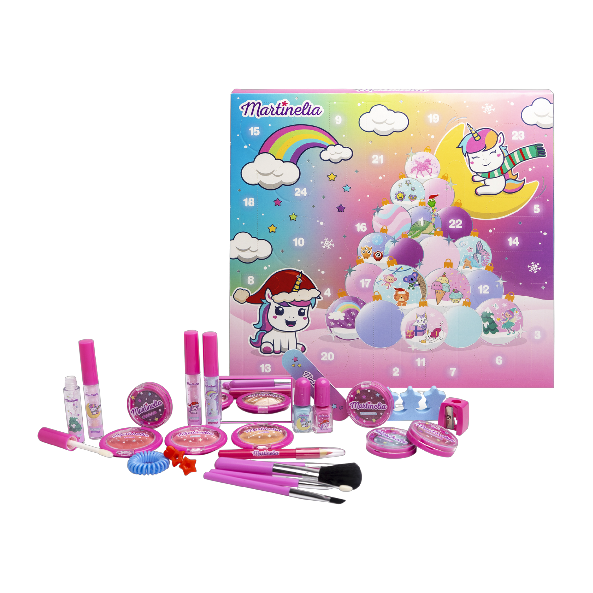 Martinelia nabízí širokou škálu zábavných a inovativních produktů ve všech barvách pro nejmenší. Dekorativní kosmetika, make-up sety, lesky a balzámy na rty, dárková balení. Všechny druhy produktů a doplňků jsou navržené tak, aby držely krok s nejnovějšími trendy. Nádherný adventní kalendář od značky Martinelia z řady Little Unicorn obsahuje 3 tvářenky, 4 oční stíny, 4 lesky na rty, 1 pilník na nehty, 1 gumičku do vlasů, 1 ořezávátko, 1 sponku do vlasů, 1 zrcátko, 1 oddělovač prstů na nohou, 1 tužku na rty, 4 štětce, 2 laky na nehty.