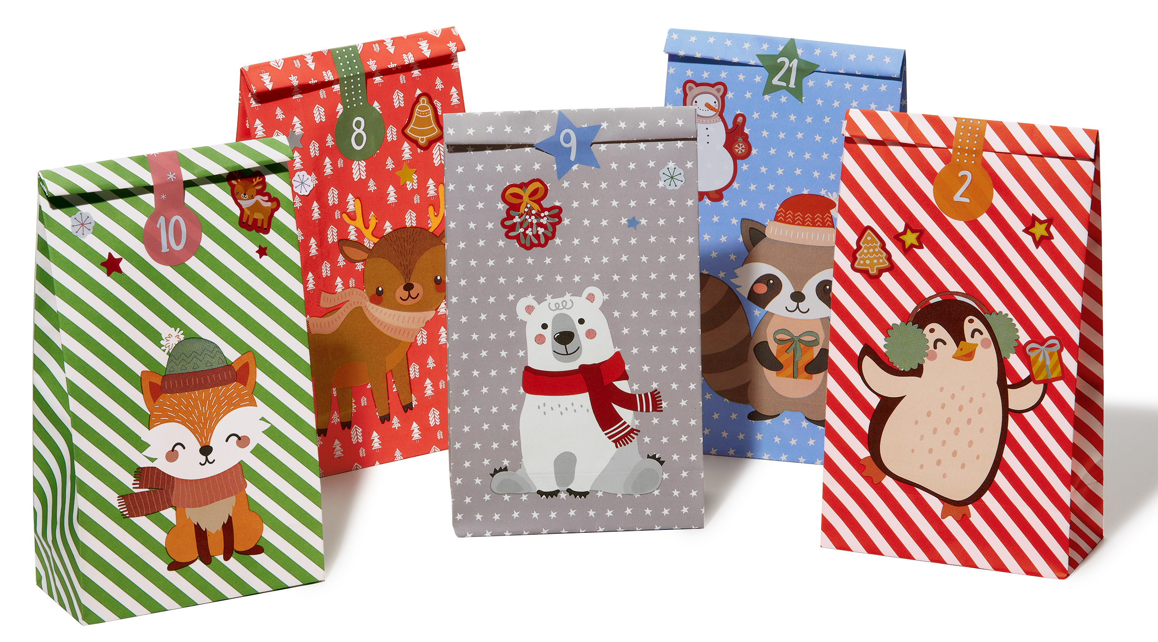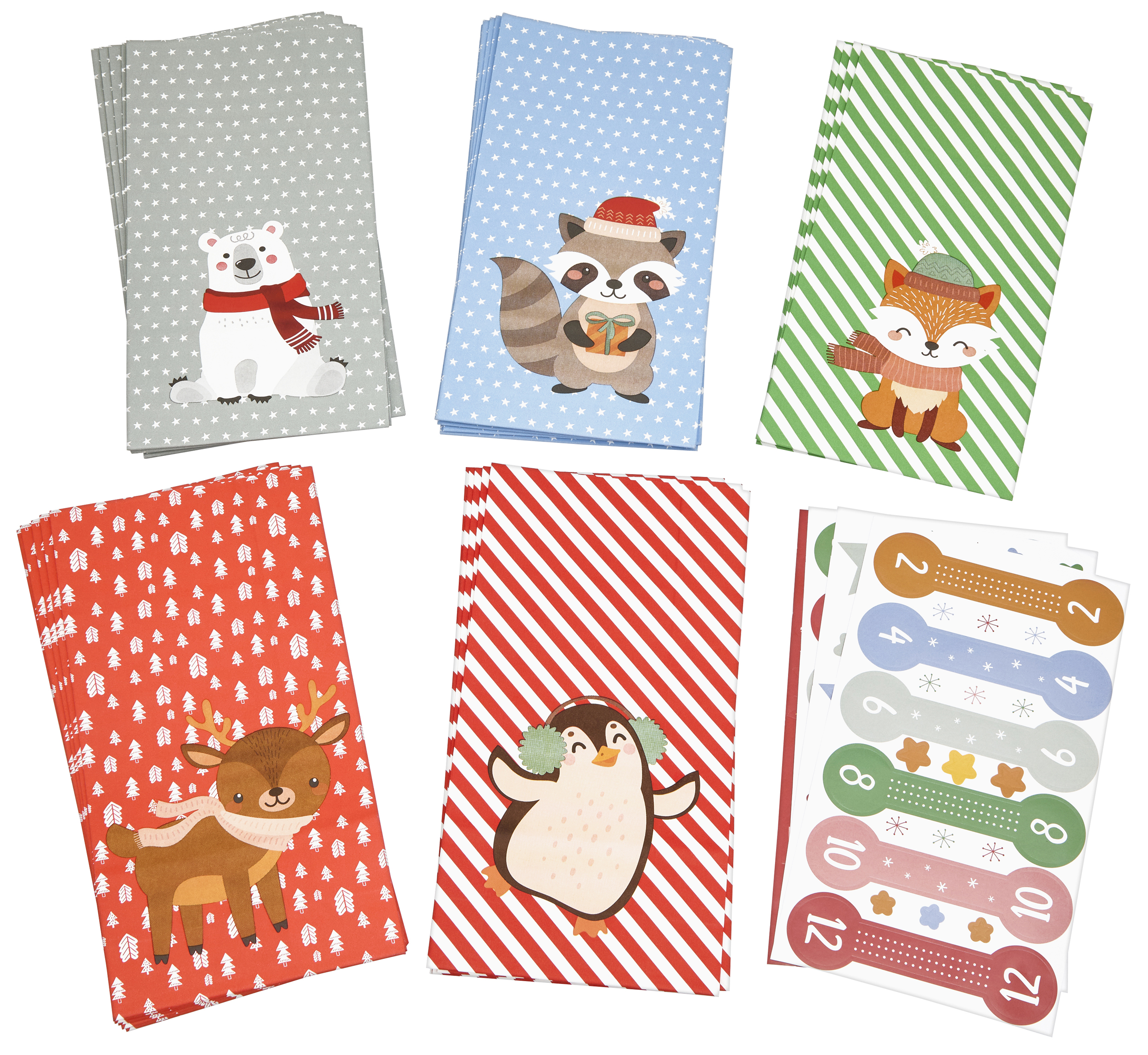 Adventní kalendářové sáčky s nálepkami pro děti.