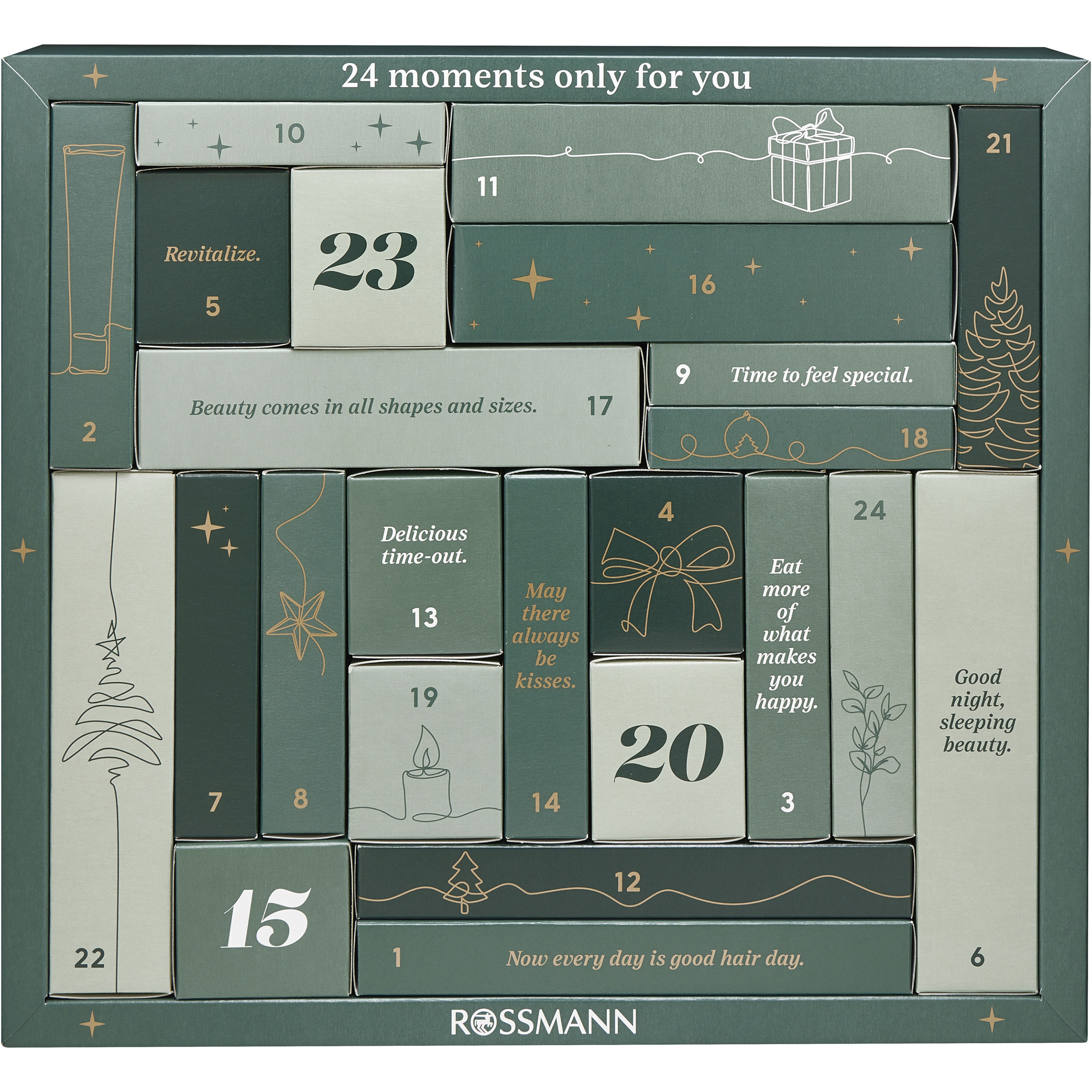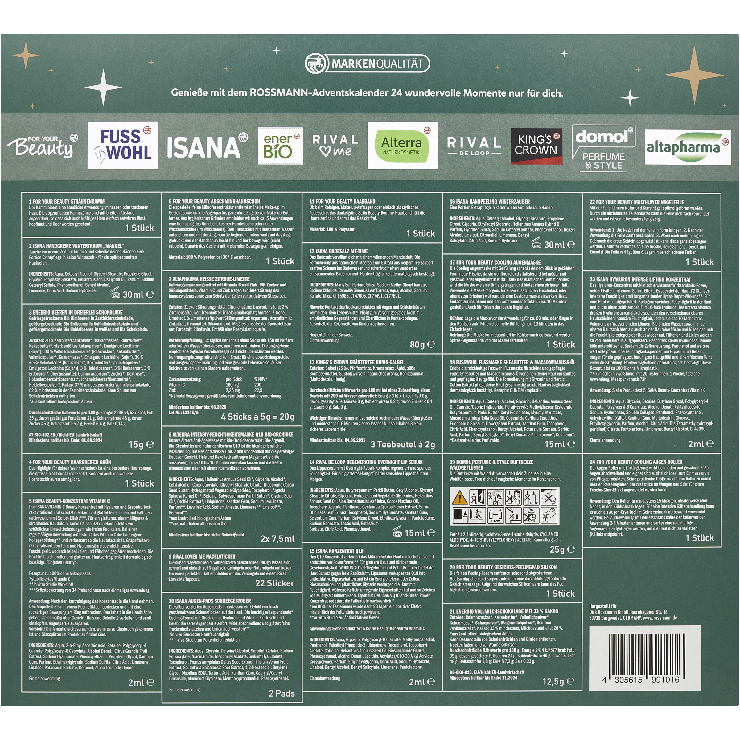 Kalendář obsahuje překvapení od značek: for your Beauty, Fusswohl, ISANA, enerBiO, RIVAL Loves Me, Alterra Naturkosmetik, King's Crown, domol, altapharma.