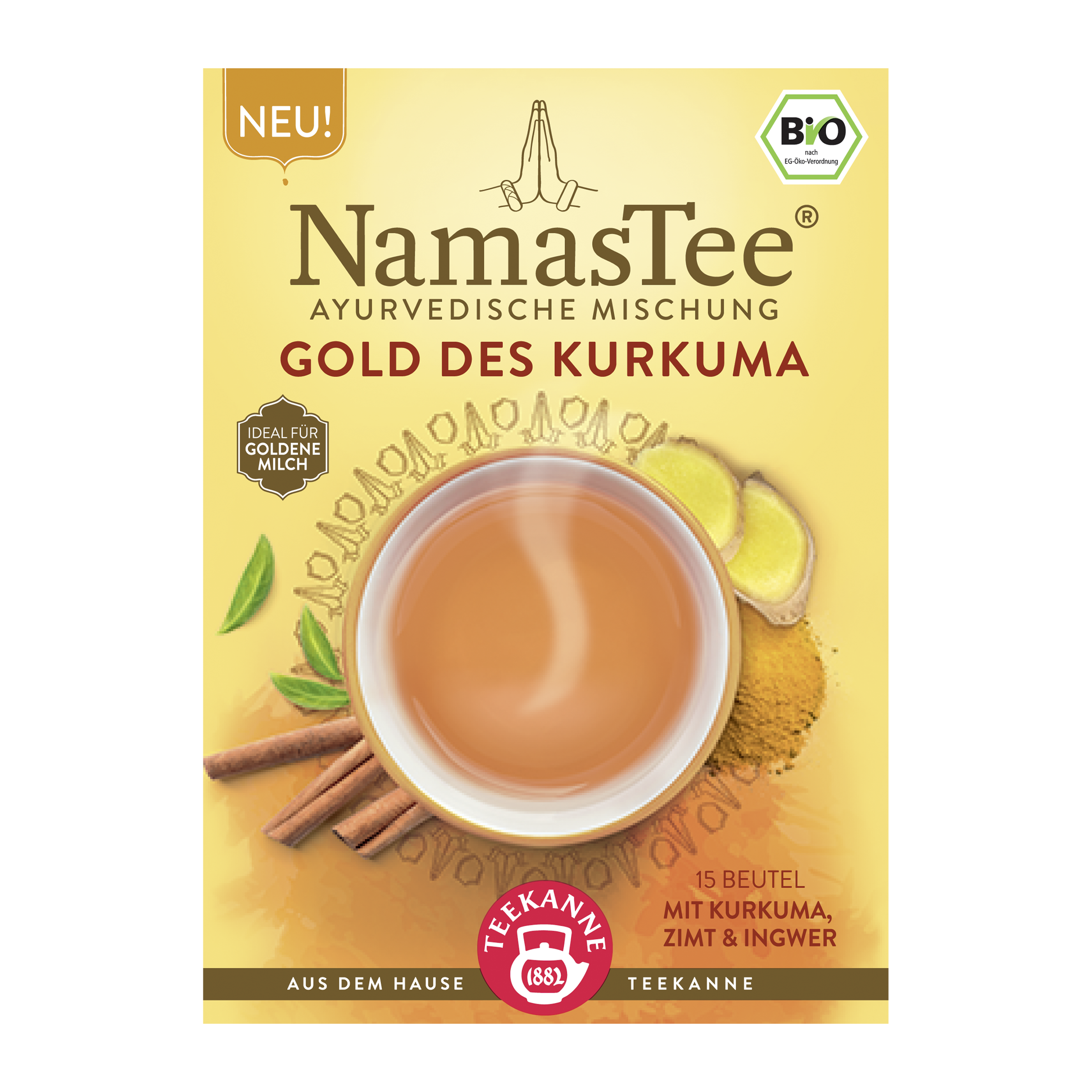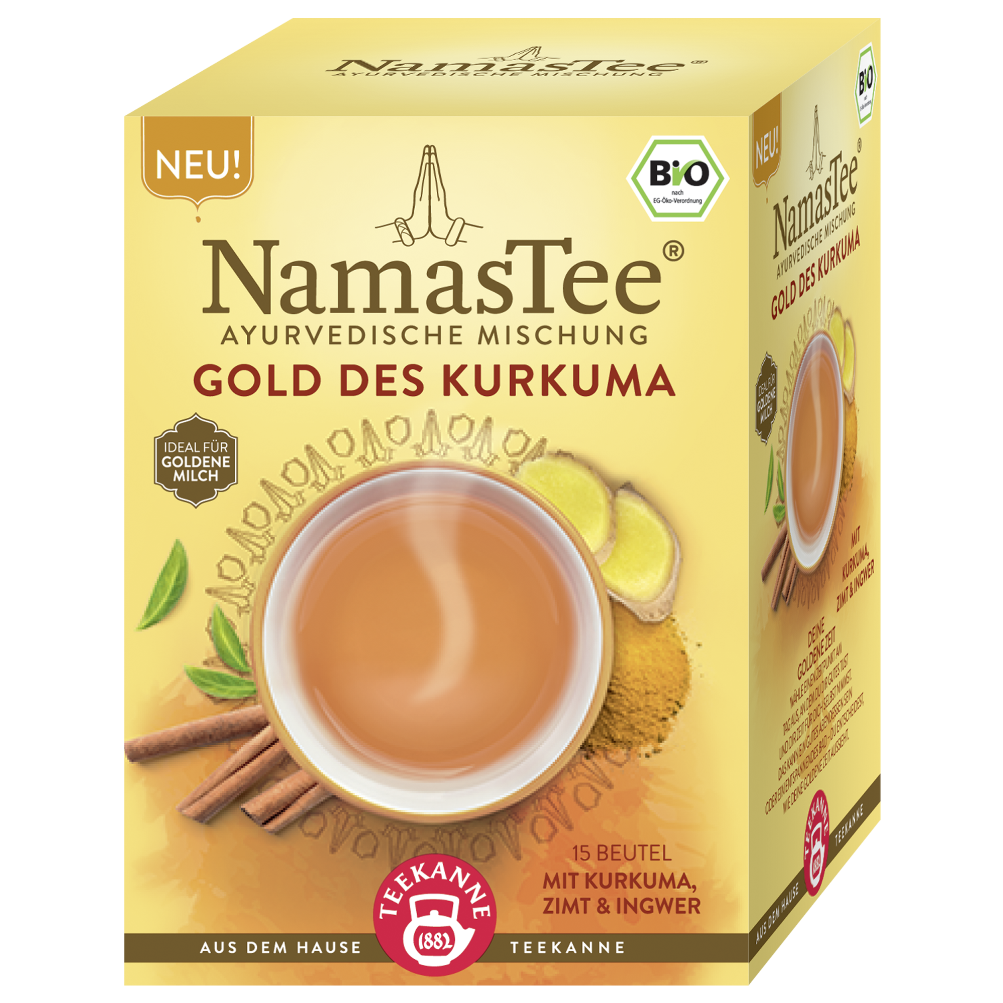 Zlato je zvláštní cennost. A zlatem života je všímavost. Zlatá barva kurkumy symbolizuje dobro a připomíná nám, abychom se starali o sebe a své blízké. NamasTee® Zlato z kurkumy je potěšení, které přesahuje chuť. Zázvor a jemná skořice rámují jemný tón zářivého kurkumového čaje. Jóga je skvělý způsob, jak si odpočinout, vyčistit svoji mysl a být k sobě pozornější. I když meditace a jóga ne vždy zapadají do každodenního života, nějaký čas pro sebe potřebujeme každý den. Čaje NamasTee® od Teekanne vás budou příjemným způsobem doprovázet při intenzivním vychutnávání chvilek pro sebe. NamasTee jsou organické bylinné a kořeněné čajové směsi podle ajurvédského stylu - s plnou chutí a smyslnou vůní. Tyto čaje jsou - jako pozdrav před jógou a po ní - poklonou duši. Základ našich čajů tvoří mnoho přírodních složek - různé druhy ovoce, bylin a samozřejmě čajové lístky. Všechno jsou to rostliny, o nichž se již po staletí tvrdí, že mají blahodárné účinky pro lidský organismus.