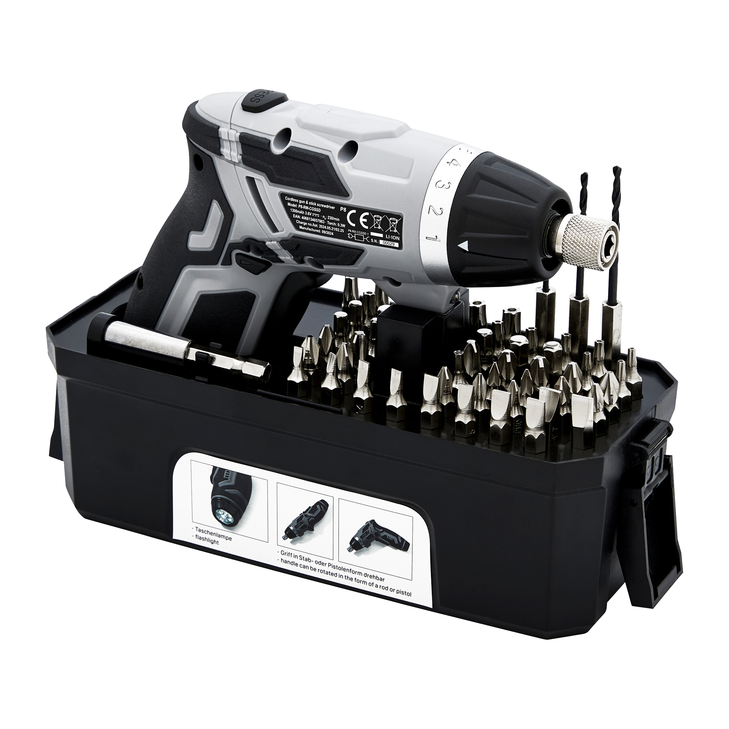 - včetně 1 nabíjecího adaptéru, 1 nástavce, 49 bitů a 3 vrtáků.