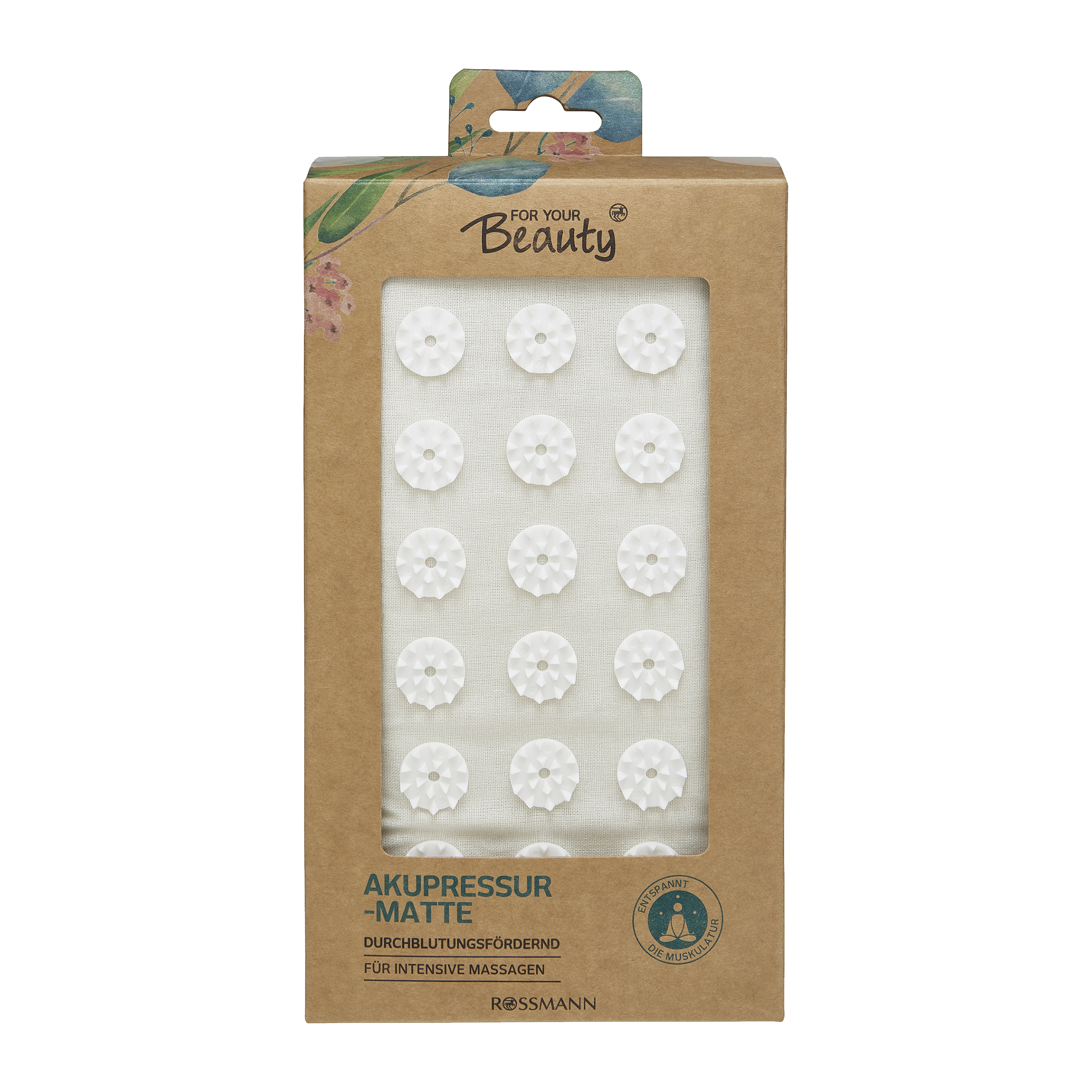 Akupresurní podložka for your Beauty nabízí všechny výhody akupresury, i když jste na cestách. Na základě poznatků tradiční čínské medicíny je navržen tak, aby pomáhal a zmírňoval bolesti krku a ramen a také napětí v dolní části zad. Podložka je poseta malými kulatými kolečky s plastovými hroty, které podporují krevní oběh. Popruh lze snadno uvázat kolem zad nebo použít jako polštář. Nejlepšího účinku se dosáhne při použití na holou pokožku. K dosažení požadovaného účinku stačí 12 až 20 minut aplikace.