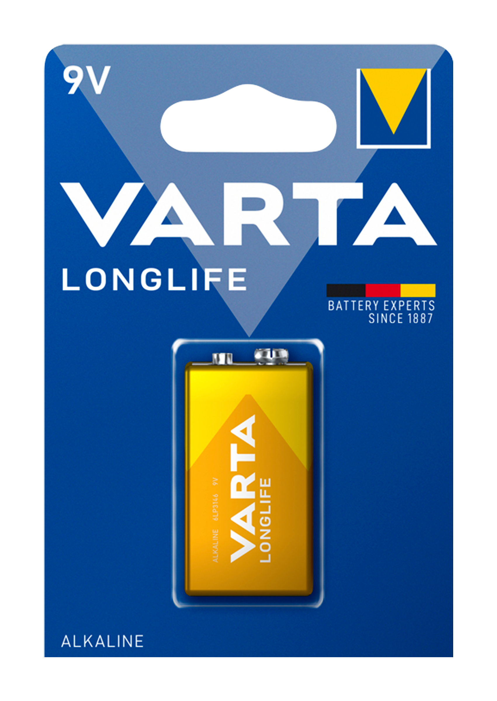 Baterie Varta Longlife s napětím 9 V s dlouhou výdrží pro přístroje každodenního použití jakou jsou dálkové ovladače, nástěnné hodiny nebo rádia.