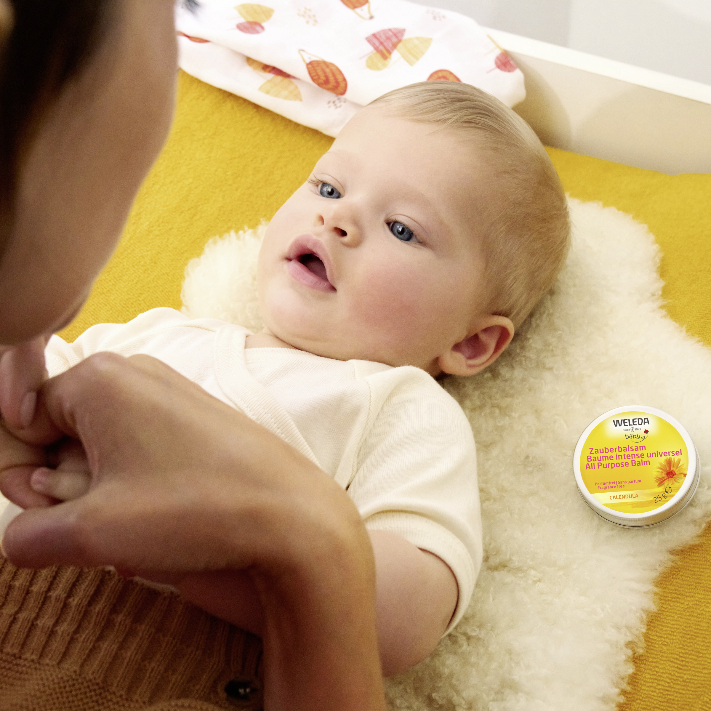 Multifunkční měsíčkový balzám intenzivně vyživuje a zjemňuje dětskou pokožku. Okamžitě zklidňuje i velmi suchá místa, hrubou kůži a suché rty a pokožce přináší úlevu. Pečující složení se slunečnicovým olejem a kakaovým máslem pomáhá obnovit přirozenou ochrannou vrstvu kůže a regeneruje ji. Pleť ochrání před větrem i mrazem, zklidní zarudlou pokožku při prořezávání zoubků. Bez parfemace a alkoholu. Vhodné pro vegany.