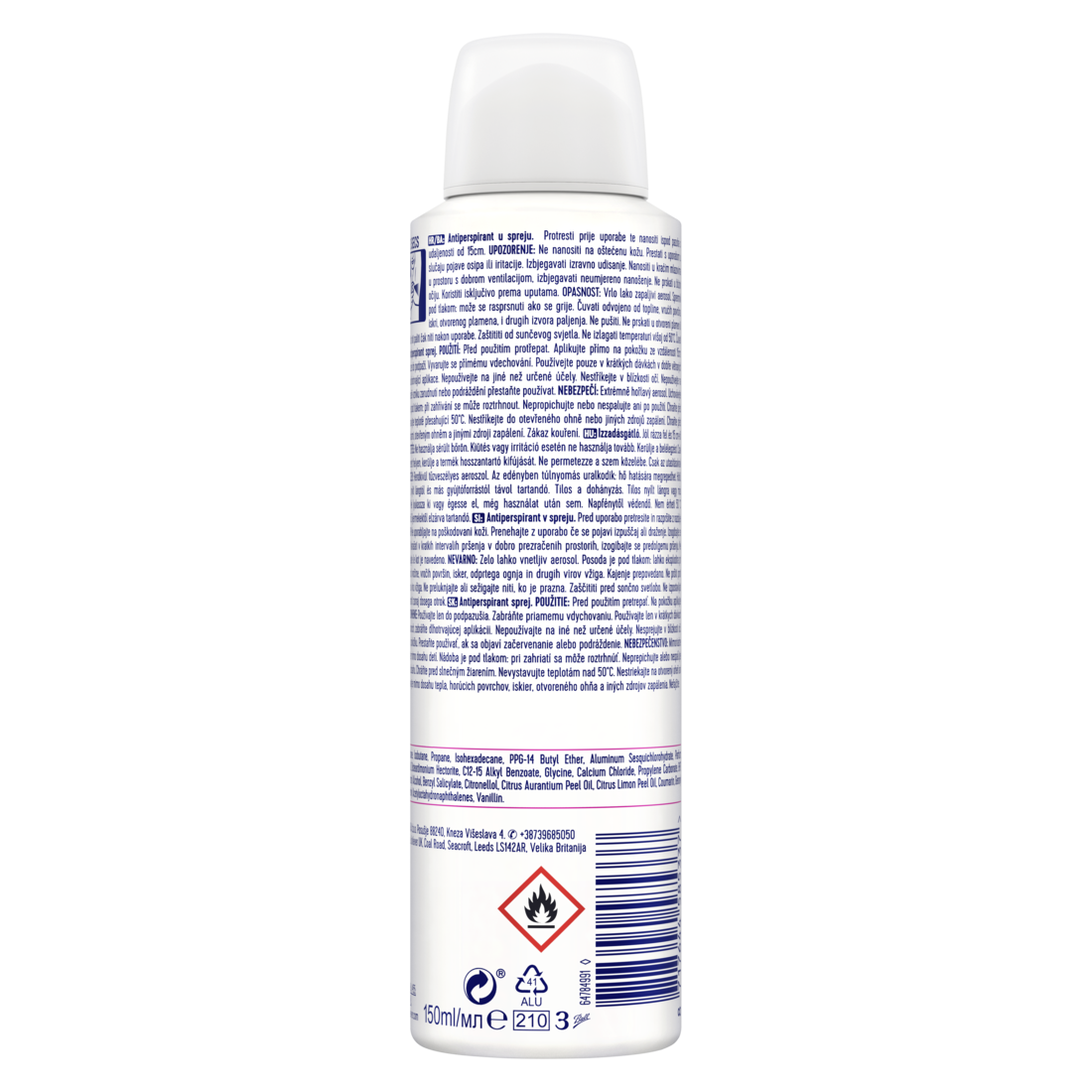 Butane, Isobutane, Propane, Isohexadecane, PPG-14 butyl ether, Aluminum sesquichlorohydrate, Parfum, Helianthus annuus seed oil, Disteardimonium hectorite, C12-15 alkyl benzoate, Glycine, Calcium chloride, Propylene carbonate, BHT, Alpha-isomethyl ionone, Benzyl alcohol, Benzyl salicylate, Citronellol, Citrus aurantium peel oil, Citrus limon peel oil, Coumarin, Geranyl acetate, Limonene, Tetramethyl acetyloctahydronaphthalenes, Vanillin