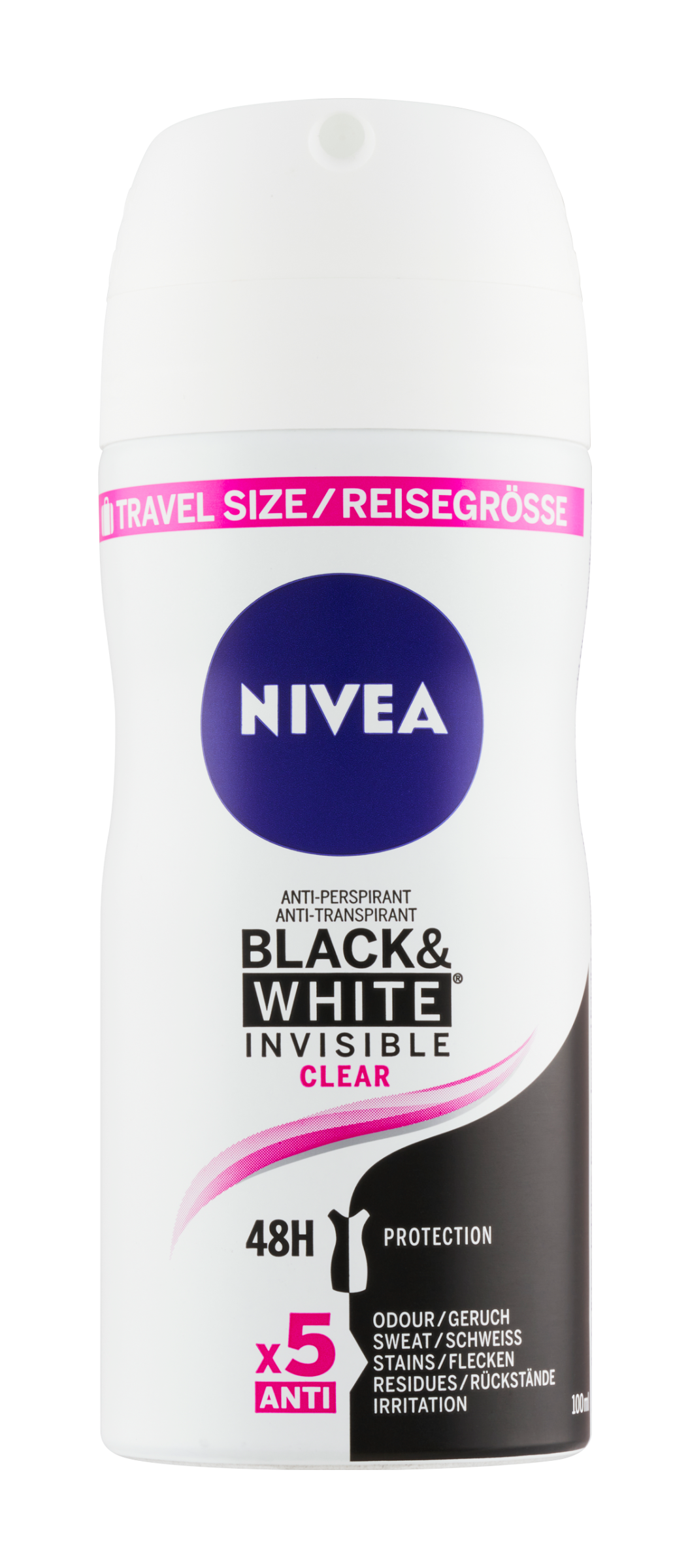 Nivea Sprej antiperspirant Black & White Invisible Clear. Pomáhá proti nadměrnému pocení a zápachu až na 48h. Nezanechává stopy jak na černém, tak i na bílém oblečení.
