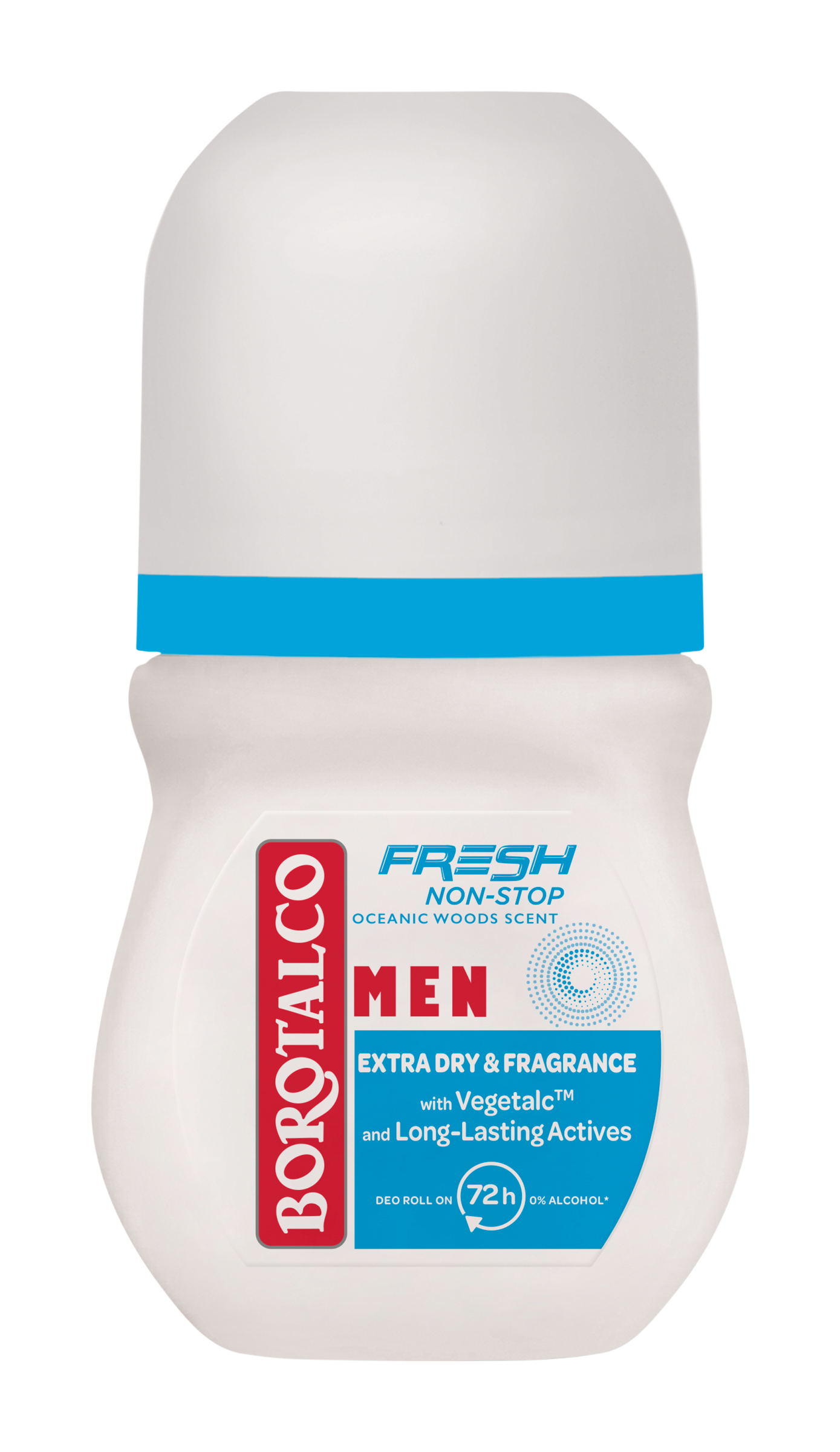 Borotalco Fresh Non-stop: extra suchý účinek a extra vůně, abyste se vždy cítili v pohodě! Složení obohacené o VegetalcTM, směs absorpčních prášků na rostlinné bázi, a osvěžující molekuly s nepřetržitým uvolňováním vůně nabízí extra suchou ochranu a dlouhotrvající svěžest na pokožce. Vůně dřeva oceánu: vůně Borotalco je obohacena o energické pačuli a olibanum, které, ozdobené zelenými a aromatickými tóny, dodávají hluboký pocit svěžesti. 72hodinová účinnost. Obsahuje 0% alkoholu. Dermatologicky testováno.