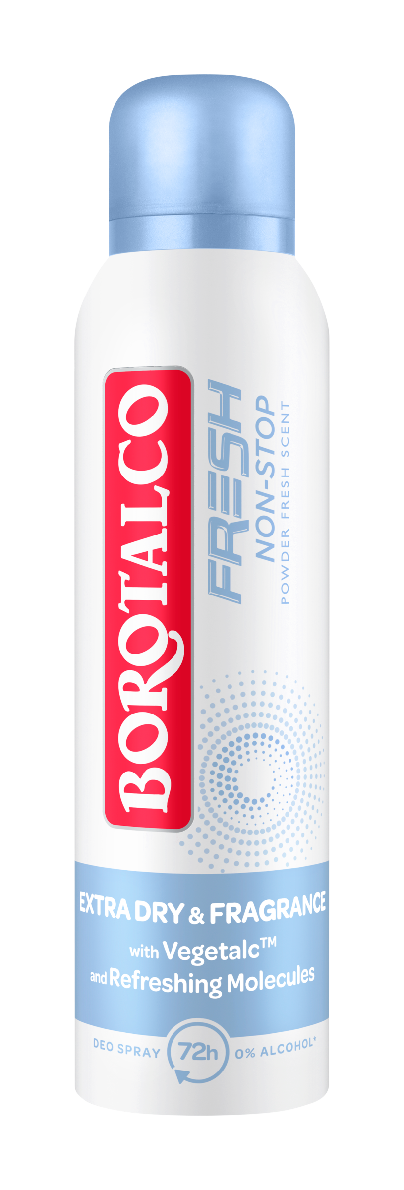 Borotalco Fresh Non-stop: extra suchý účinek a extra vůně, abyste se vždy cítili v pohodě! Složení obohacené o VegetalcTM, směs absorpčních prášků na rostlinné bázi, a osvěžující molekuly s nepřetržitým uvolňováním vůně nabízí extra suchou ochranu a dlouhotrvající svěžest na pokožce. Pudrová svěží vůně: vůně Borotalco je obohacena o zelené a citrusové tóny, které svou živostí dodávají pocit nesrovnatelné svěžesti. 72hodinová účinnost. Obsahuje 0% alkoholu. Dermatologicky testováno.