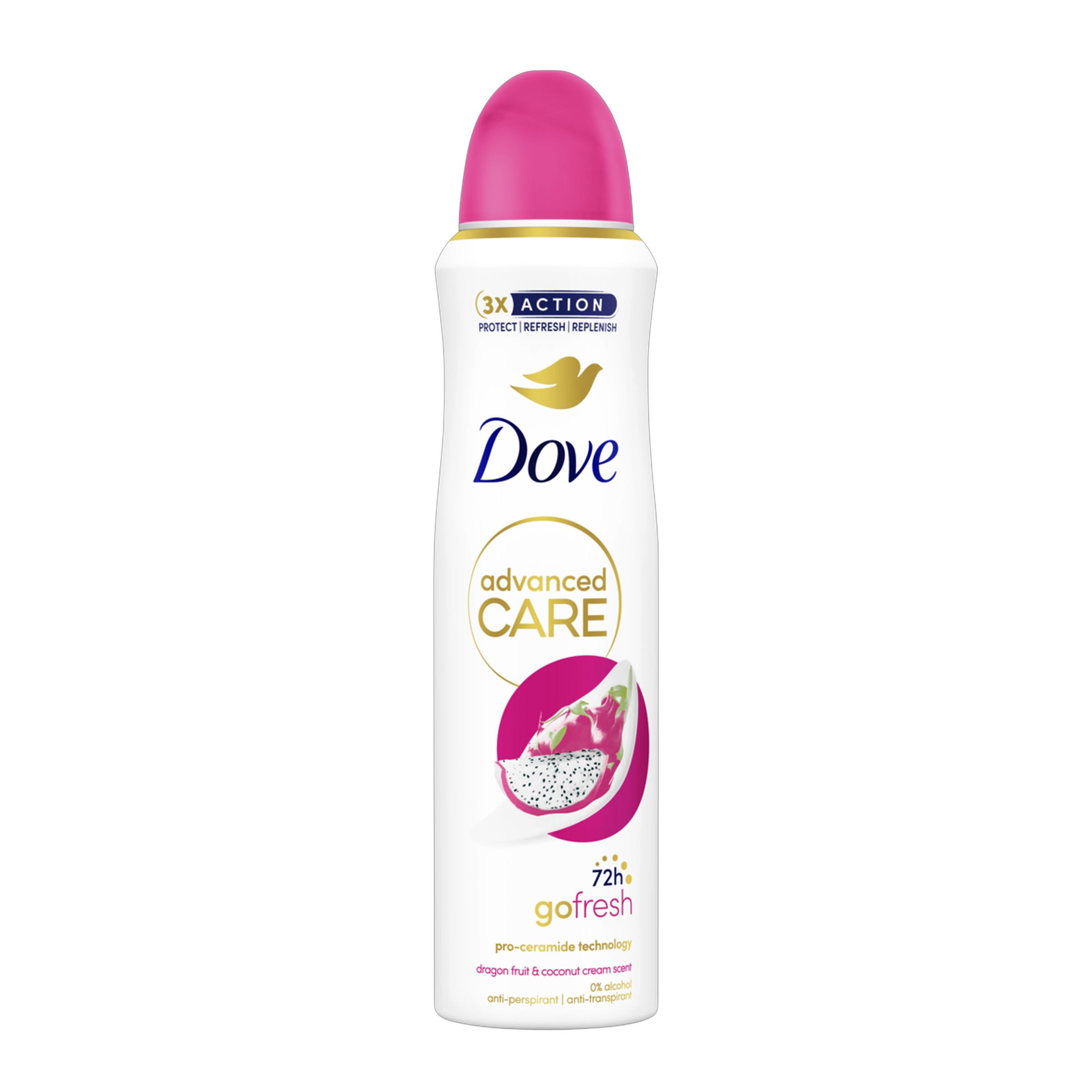Objevte Dove Advanced Care Dragonfruit & Coconut Cream antiperspirant ve spreji pro 72hodinovou ochranu a svěží podpaží. Poskytne vám 72hodinovou ochranu před potem a zápachem, stejně jako hladké a hydratované podpaží. Připravte se na to, abyste se mohla cítit sebejistě. Tento deodorant je plný prémiových pečujících složek naší receptury Advanced Care.