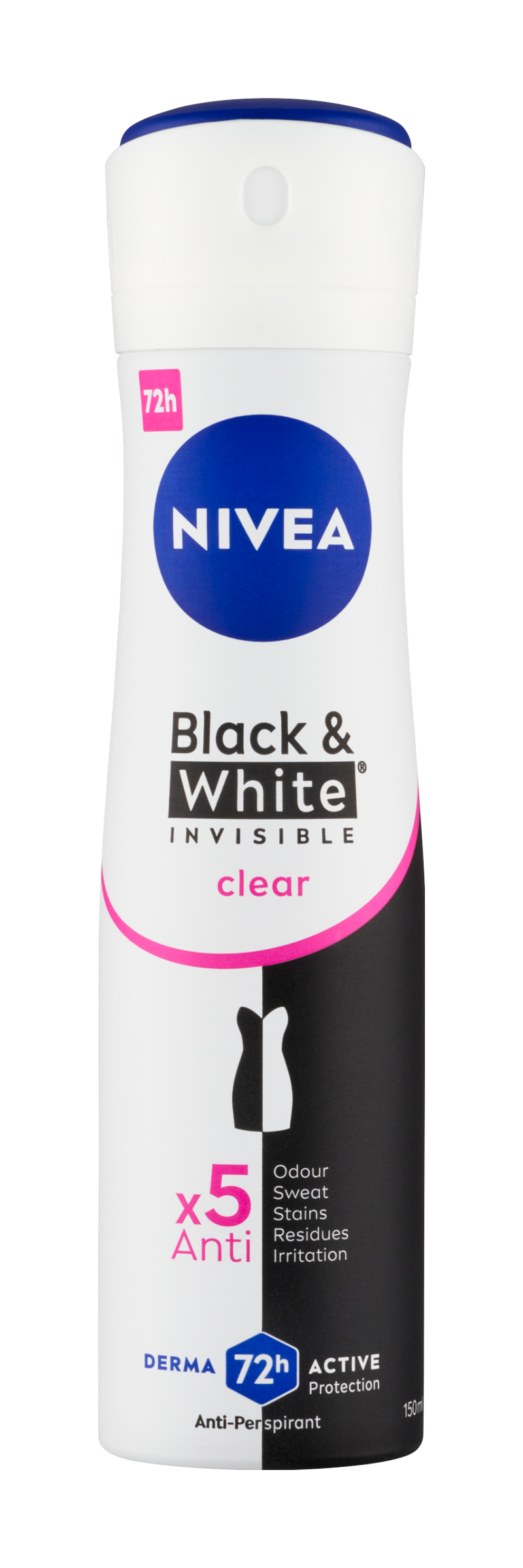 Poznejte skutečně účinný antiperspirant bez alkoholu* a s atraktivní květinovou vůní, který chrání proti pocení i zápachu a ochrání také vaše oblečení. Složení antiperspirantů s unikátní patentovanou technologií, která zabraňuje vzniku bílých stop na černém oblečení a pomáhá předcházet vzniku žlutých skvrn, které se mohou časem objevit na bílém oblečení. S naší neúčinnější technologií Derma Active získáte ochranu proti pocení a pachu potu až na 72 hodin. Jemné složení ale zároveň o pokožku pečuje a předchází podráždění. Seznamte se se světovou jedničkou v deodorantech nezanechávajících skvrny na oblečení:** NIVEA Sprej antiperspirant Black & White Invisible Clear.