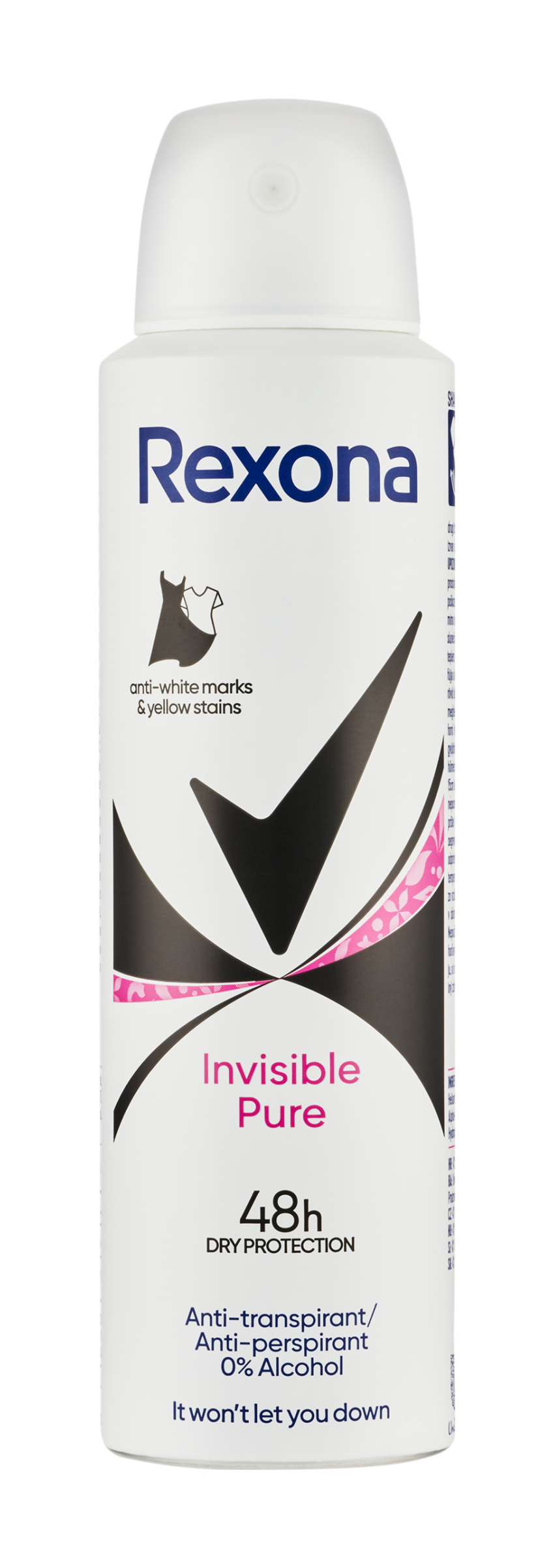 Zůstaň sebevědomá po celý den díky svěžesti, jež ti dodá antiperspirant Rexona Invisible Pure. 48hodinová ochrana s tebou udrží krok a zabrání pocení i zápachu ve všech situacích, které tě během dne potkají. Můžeš bez obav nosit své oblíbené kousky z šatníku, protože dámský antiperspirant Rexona Invisible Pure byl speciálně navržen tak, aby tvoje oblečení zůstalo krásné a beze skvrn. Jiné antiperspiranty mohou zanechat stopy v případě jejich reakce s potem. Formule antiperspirantu Rexona Invisible Pure funguje odlišně - zatímco ty jsi chráněná proti potu a nepříjemnému zápachu, tvé oblečení zůstává beze skvrn. Rexona Invisible Pure tě spolehlivě ochrání proti potu a nepříjemnému zápachu, a to až po dobu 48 hodin. Kdekoliv jsi, cokoliv během dne děláš, antiperspirant Rexona Invisible Pure bude vždy s tebou a pomůže ti zůstat sebevědomou. Obsahuje také inovativní patentovanou technologii MotionsenseTM založenou na přítomnosti mikrokapslí, jež obsahují vůni a díky tření při pohybu postupně praskají. Dochází tak k pozvolnému uvolňování parfemace podle fyzické aktivity. Platí zde úměra, že čím více se člověk pohybuje, tím intenzivněji antiperspirant voní. Rexona antiperspirant sprej Invisible Pure kromě účinné ochrany nabízí i jiskřivou ovocnou vůni jablek a hrušek. Rexona. Nezradí tě!