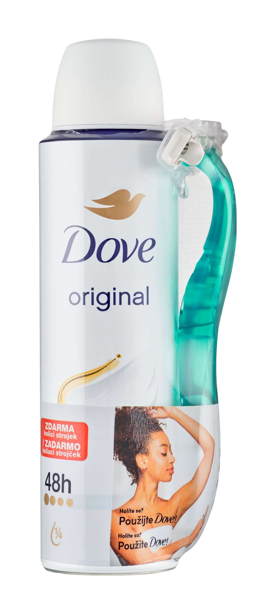 Pokud hledáte antiperspirant ve spreji, který kombinuje ochranu s péčí, už nehledejte. Náš antiperspirant ve spreji Dove Original obsahuje totiž ¼ hydratačního krému a 100% přírodní pečující olej, které zanechají pokožku v podpaží jemnou a hladkou na dotek. Tento antiperspirant sprej nabízí navíc 48hodinovou ochranu před potem a zápachem. Klasická vůně tohoto antiperspirantu s jemnými svěžími tóny dodá Vaší rutině péče o tělo nádech pohodlí, kdykoli to budete potřebovat. Balení obsahuje antiperspirant a holicí strojek.
