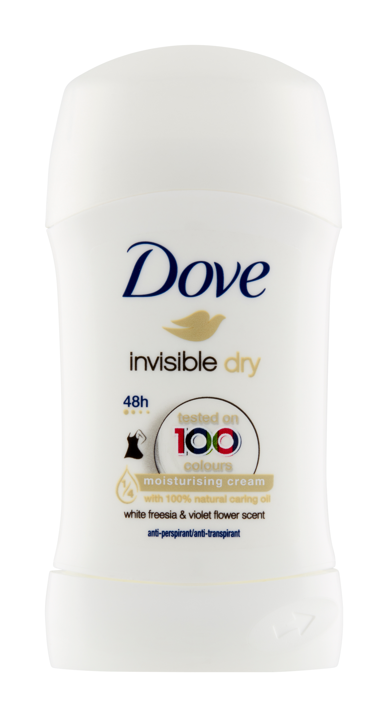 Antiperspirant sprej Dove Invisible Dry, jenž nezanechává bílé skvrny na stovce barev, chrání jak vás, tak vaše šaty.