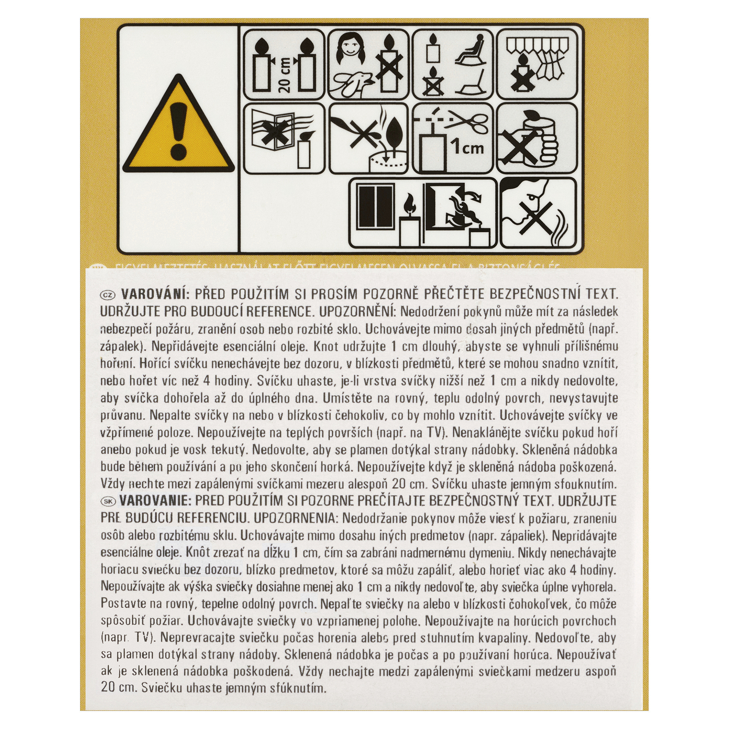Air Wick svíčka - Vanilka a karamel. Uchovávejte mimo dosah dětí. Je-li nutná lékařská pomoc, mějte po ruce obal nebo štítek výrobku. Obsahuje p-methoxybenzyl-acetát. Může vyvolat alergickou reakci. VAROVÁNÍ: PŘED POUŽITÍM SI PROSÍM POZORNĚ PŘEČTĚTE BEZPEČNOSTNÍ TEXT. UDRŽUJTE PRO BUDOUCÍ REFERENCE. UPOZORNĚNÍ: Nedodržení pokynů může mít za následek nebezpečí požáru, zranění osob nebo rozbité sklo. Uchovávejte mimo dosah jiných předmětů (např. zápalek). Nepřidávejte esenciální oleje. Knot udržujte 1 cm dlouhý, abyste se vyhnuli přílišnému hoření. Hořící svíčku nenechávejte bez dozoru, v blízkosti předmětů, které se mohou snadno vznítit, nebo hořet víc než 4 hodiny. Svíčku uhaste, je-li vrstva svíčky nižší než 1 cm a nikdy nedovolte, aby svíčka dohořela až do úplného dna. Umístěte na rovný, teplu odolný povrch, nevystavujte průvanu. Nepalte svíčky na nebo v blízkosti čehokoliv, co by mohlo vznítit. Uchovávejte svíčky ve vzpřímené poloze. Nepoužívejte na teplých površích (např. na TV). Nenaklánějte svíčku pokud hoří anebo pokud je vosk tekutý. Nedovolte, aby se plamen dotýkal strany nádobky. Skleněná nádobka bude během používání a po jeho skončení horká. Nepoužívejte když je skleněná nádoba poškozená. Vždy nechte mezi zapálenými svíčkami mezeru alespoň 20 cm. Svíčku uhaste jemným sfouknutím.