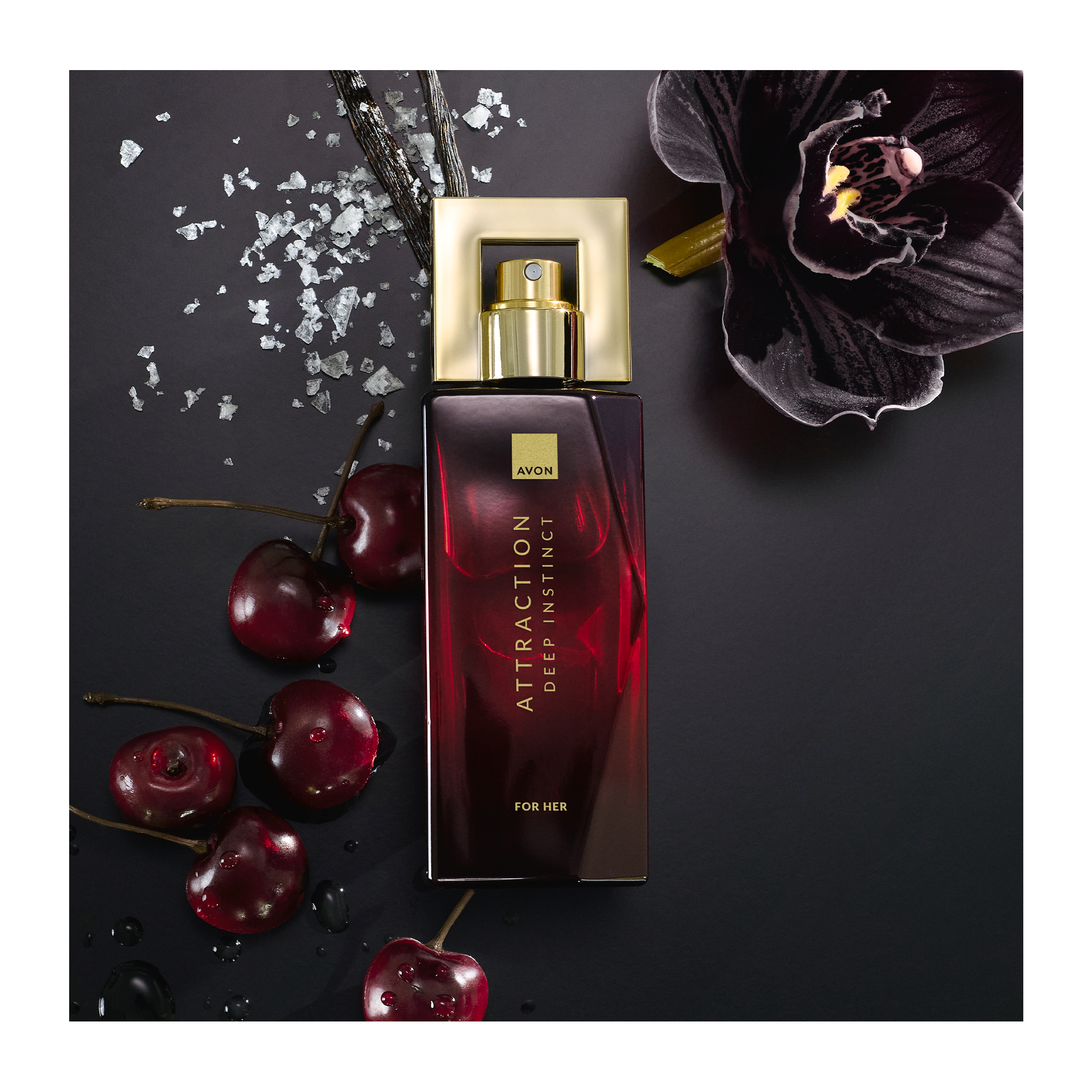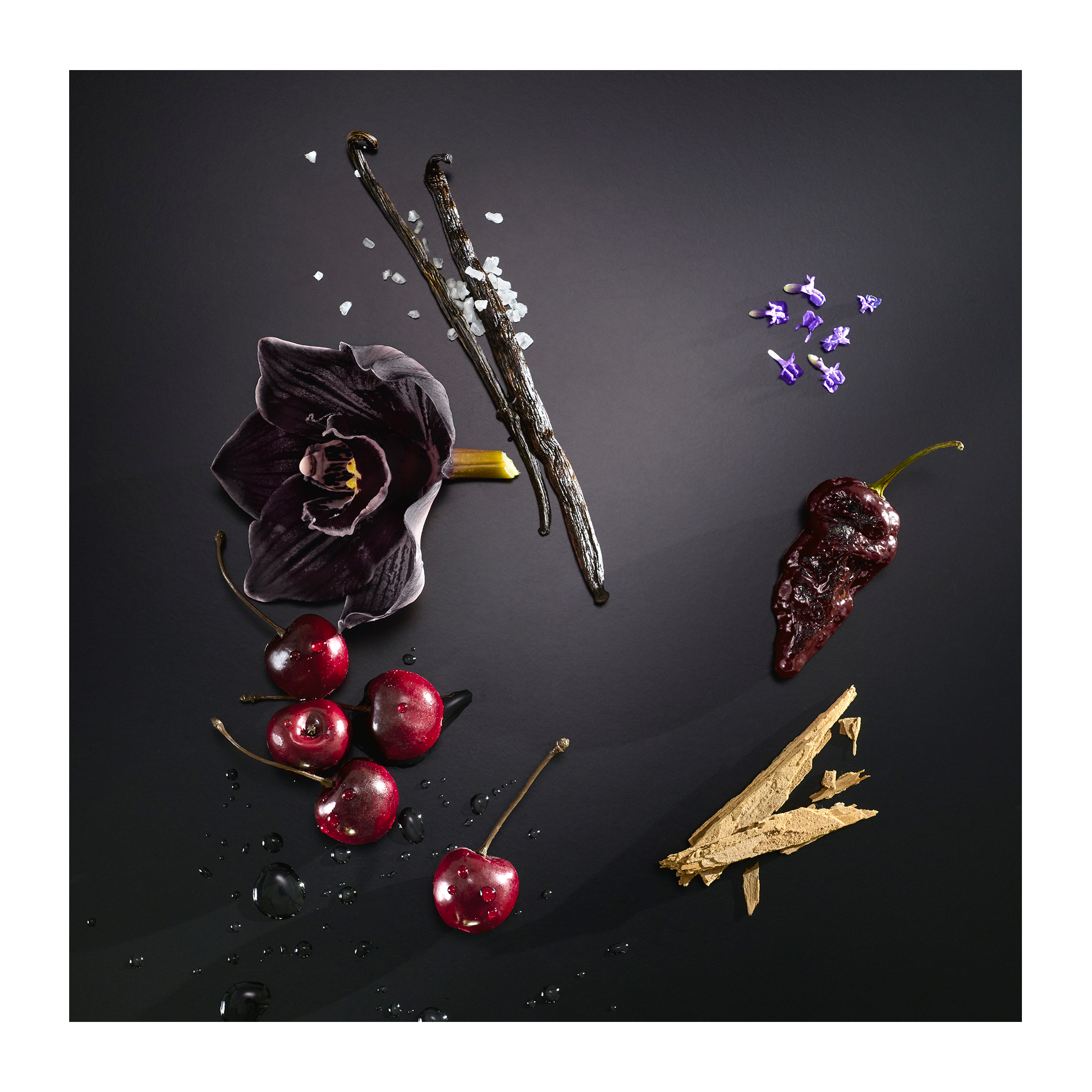 Zralá a šťavnatá třešeň se snoubí s pronikavými tóny ambry a afrodiziakální černou orchidejí na smyslném základu ze slané vanilky. Podmanivá atmosféra noci prodchnutá orientálními a kouřovými tóny.
