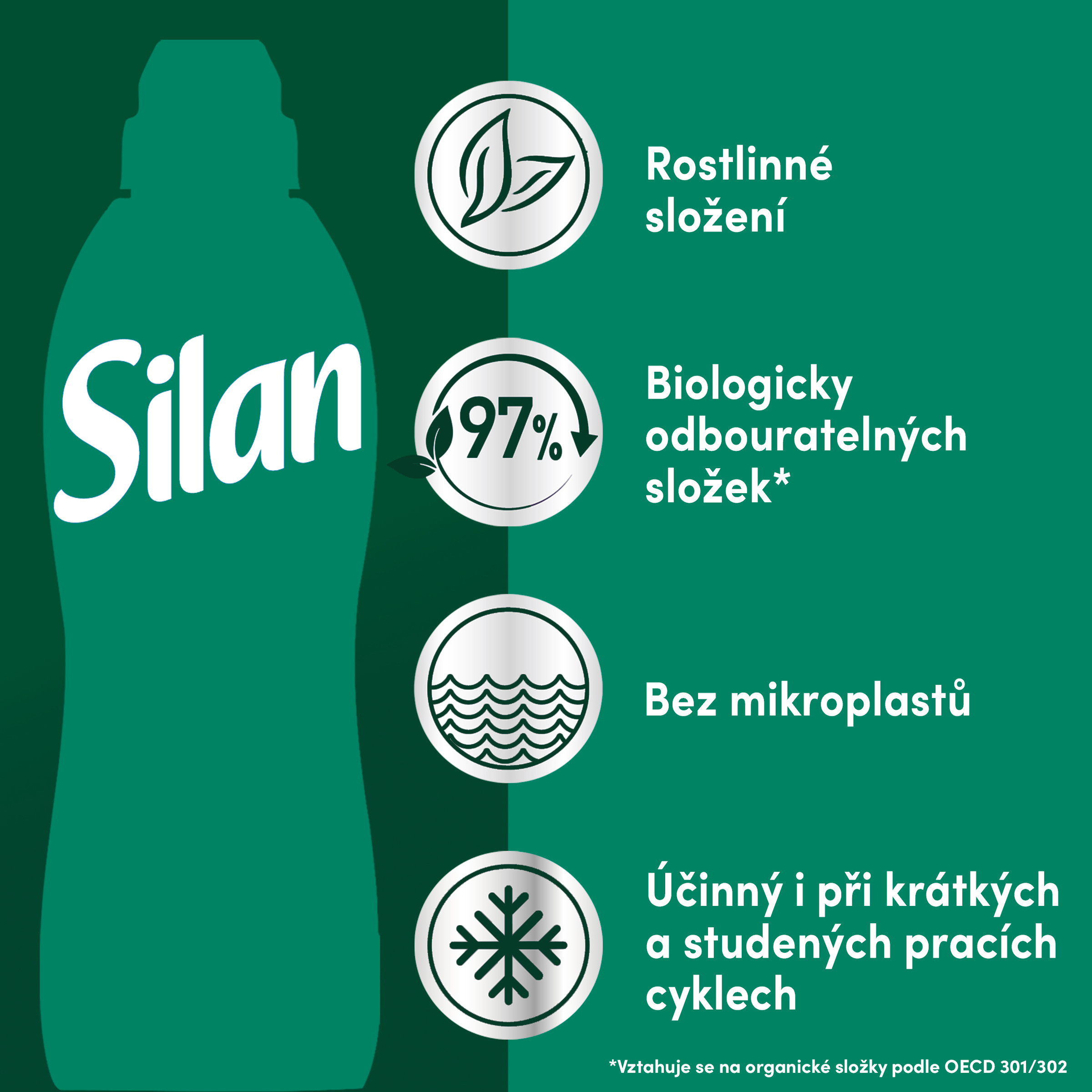 Šetrná k prádlu i k planetě. Láhev Silanu je vyrobena ze 100% recyklovaného plastu** a jeho složení obsahuje 97 % biologicky rozložitelných složek* a neobsahuje mikroplasty. Užijte si podmanivou vůni a hebkost Silanu i při krátkých a studených pracích cyklech.