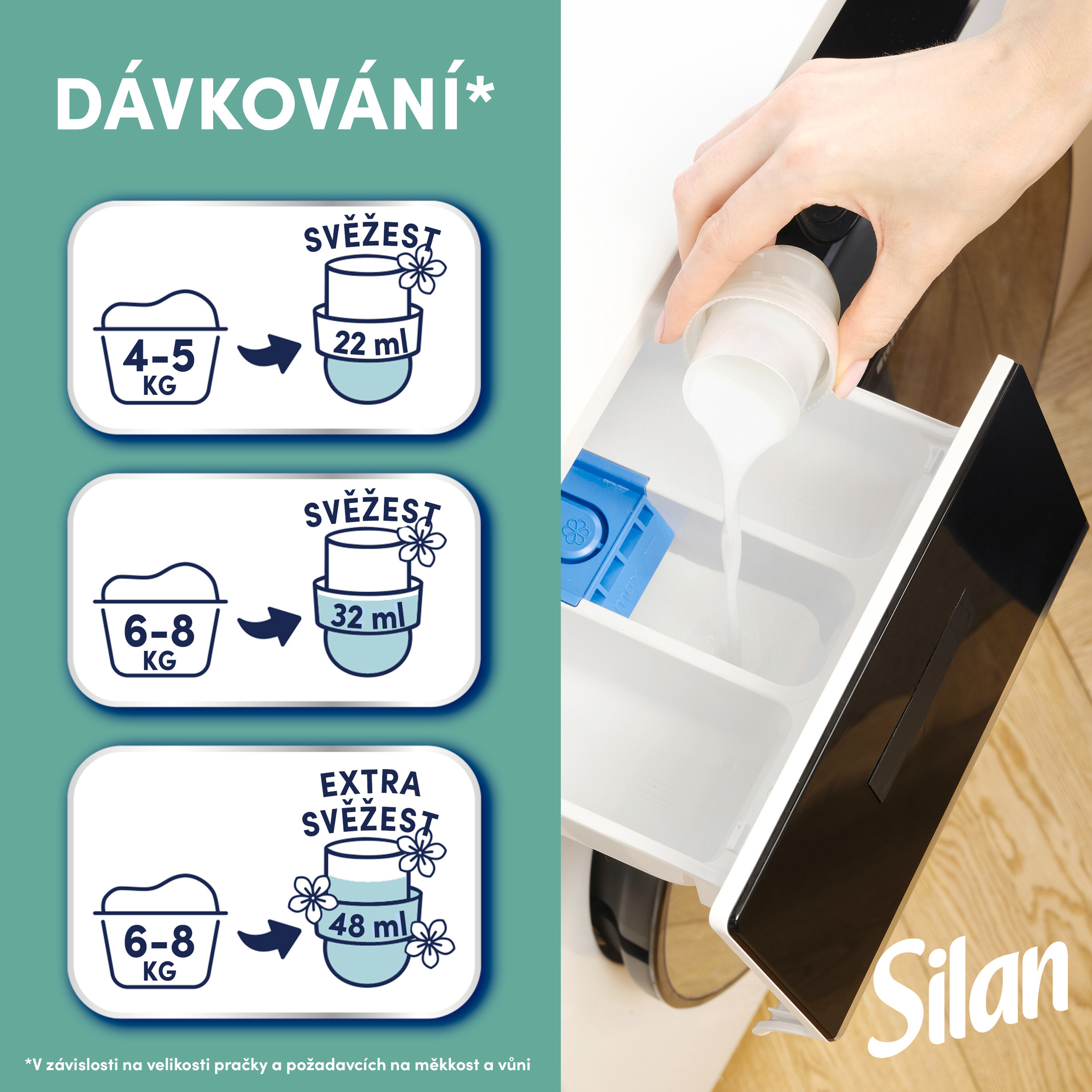 Nalijte přímo do přihrádky určené na aviváž. Vhodné pro pračky typu HE (High Efficiency) i standardní pračky. Dávkování: Použijte 22 ml na standardní prací cyklus (4-5 kg). Při větším množství prádla 6-8 kg použijte 32 ml nebo 48 ml pro extra dávku svěžesti.*** *** Podle velikosti pračky a požadované hebkosti.