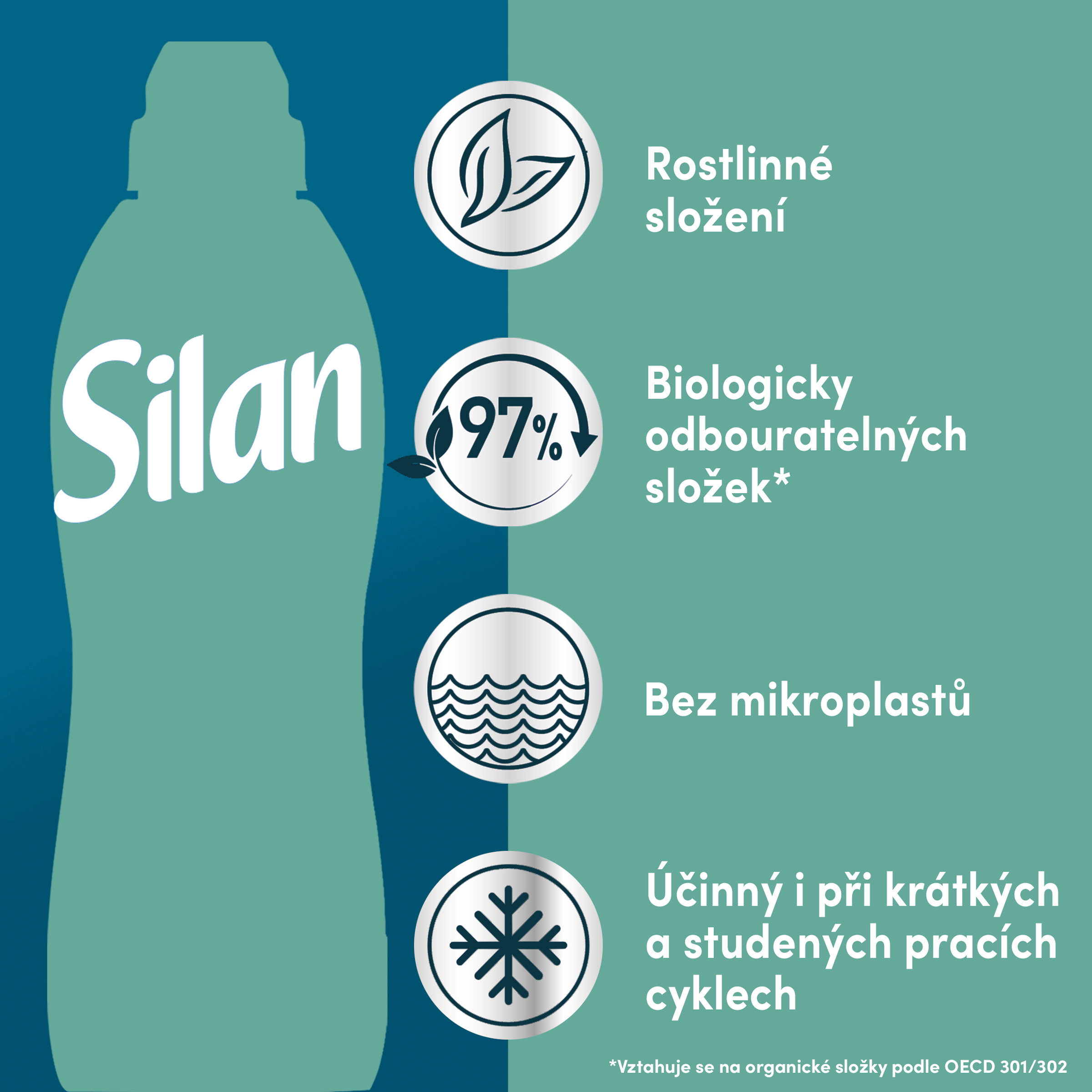 Šetrná k prádlu i k planetě. Lahev Silanu je vyrobena ze 100 % recyklovaného plastu** a jeho složení obsahuje 97 % biologicky rozložitelných složek* a neobsahuje mikroplasty. Vychutnejte si podmanivou vůni a hebkost Silanu i při krátkých a studených pracích cyklech.