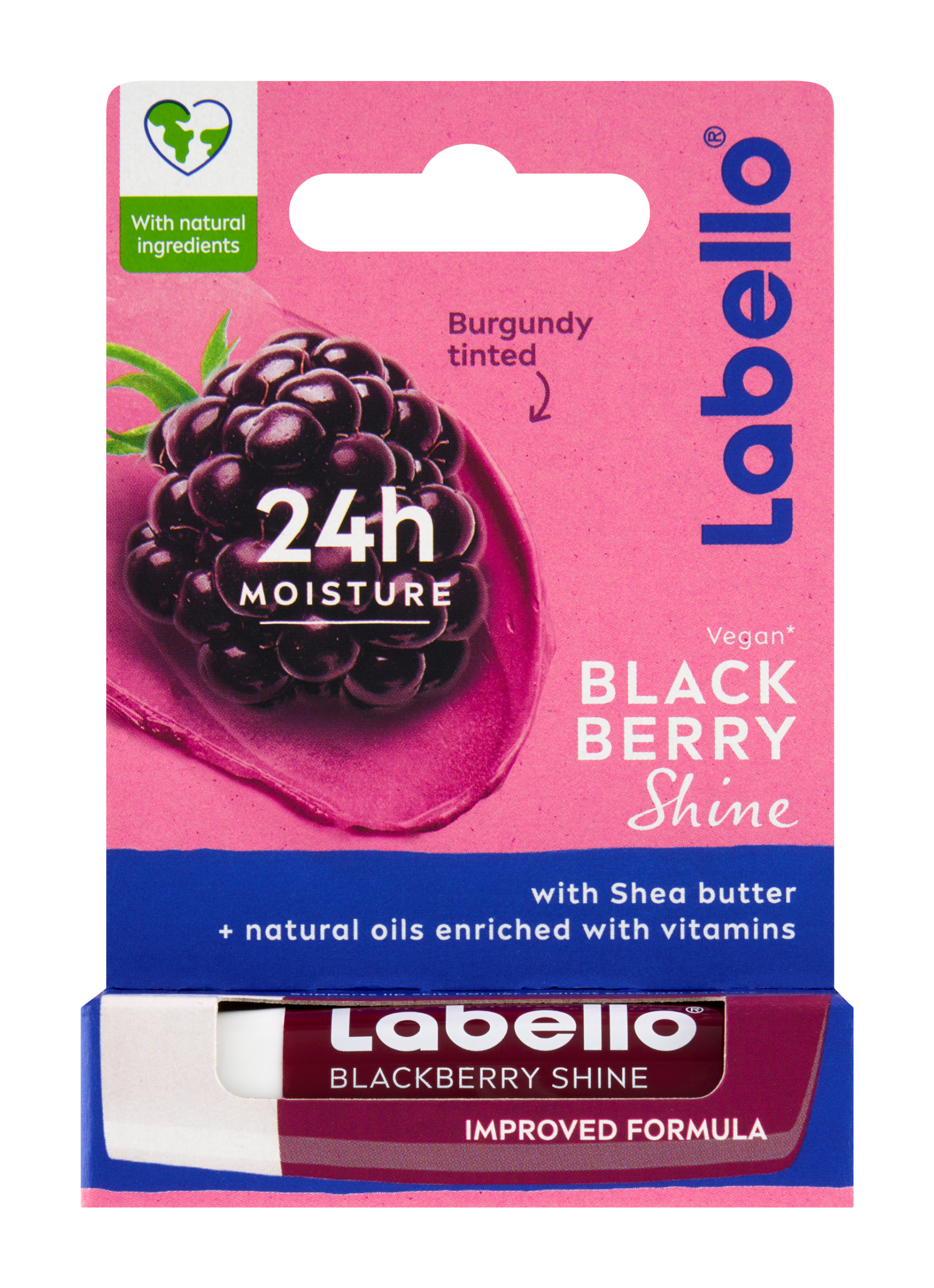 Labello® Tónovací balzám na rty Blackberry Shine s bambuckým máslem a ostružinovým aroma dodá rtům jemný bordó lesk a chrání je před chladem, větrem a suchým vzduchem. 24 h hydratace - klinicky testováno.