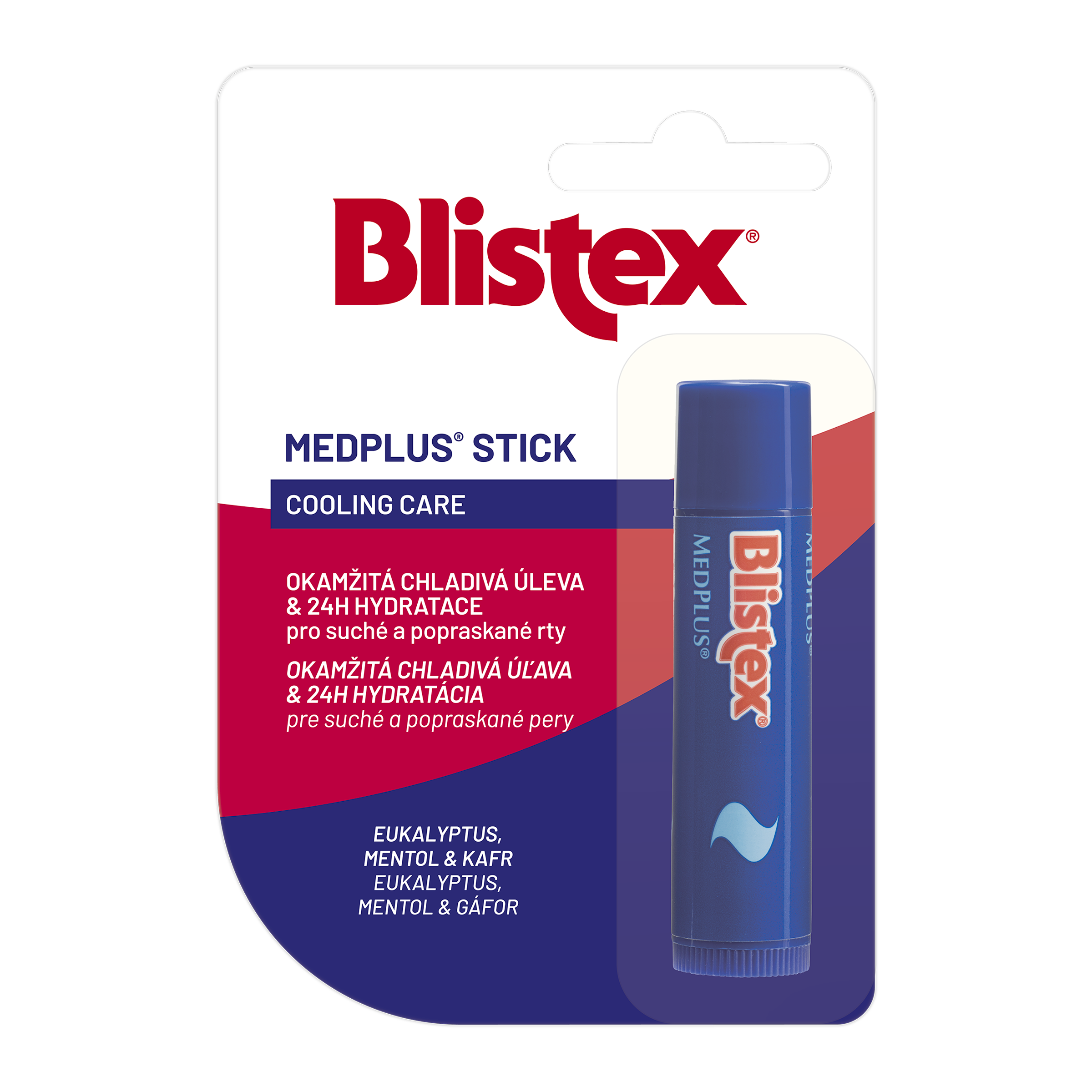 Blistex MedPlus® stick přináší okamžitou chladivou úlevu a ochranu pro bolavé, vysušené a popraskané rty. Obsažené látky, jako je mentol, eukalyptus a kafr, pomáhají zklidnit bolavé rty a dodávají jim potřebnou hydrataci. Obsahuje ochranný faktor SPF 15. Dermatologicky testováno.