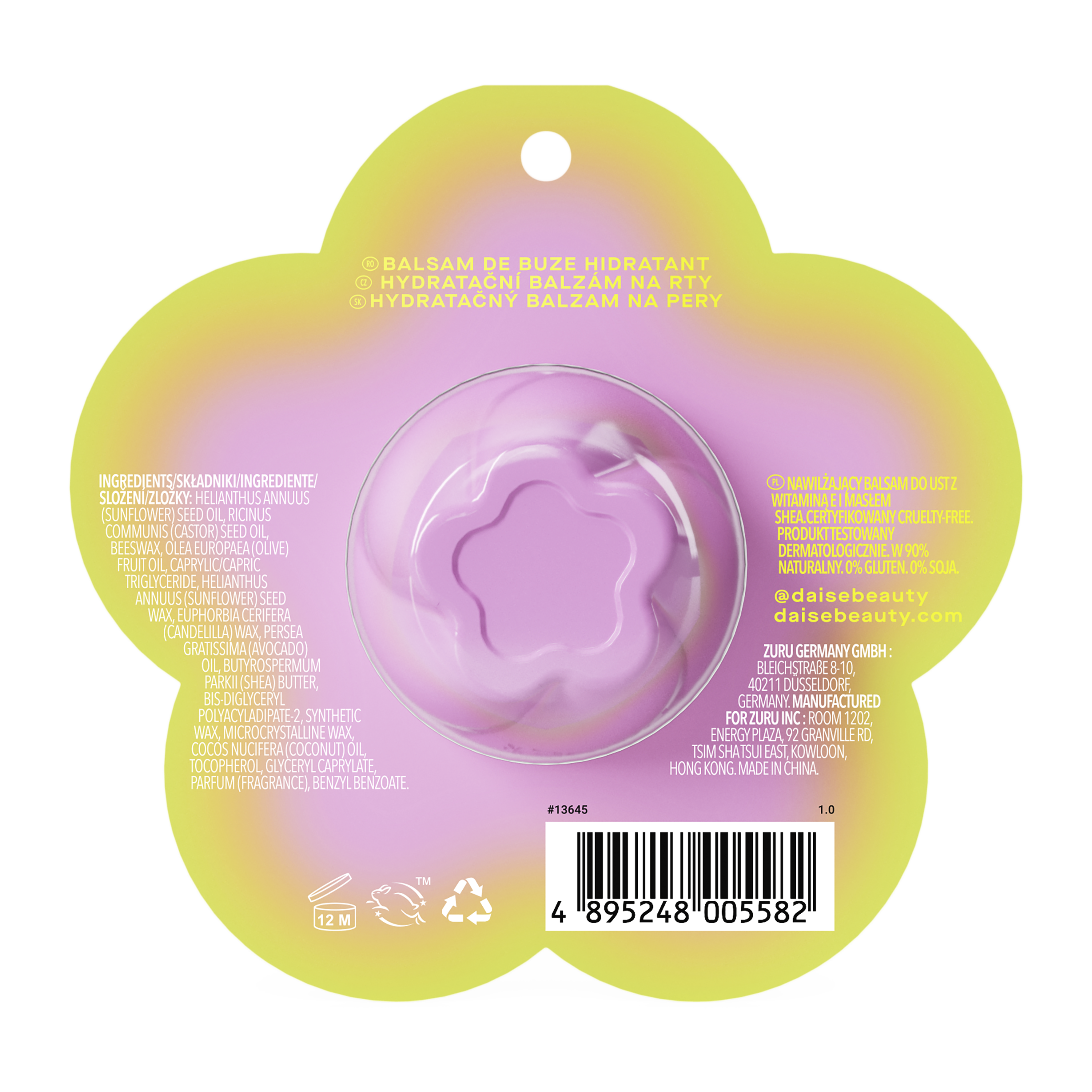 Otočením odhalte balzám ve tvaru květu. Aplikujte dle potřeby, buď samostatně, nebo jako podkladovou bázi pod rtěnku.