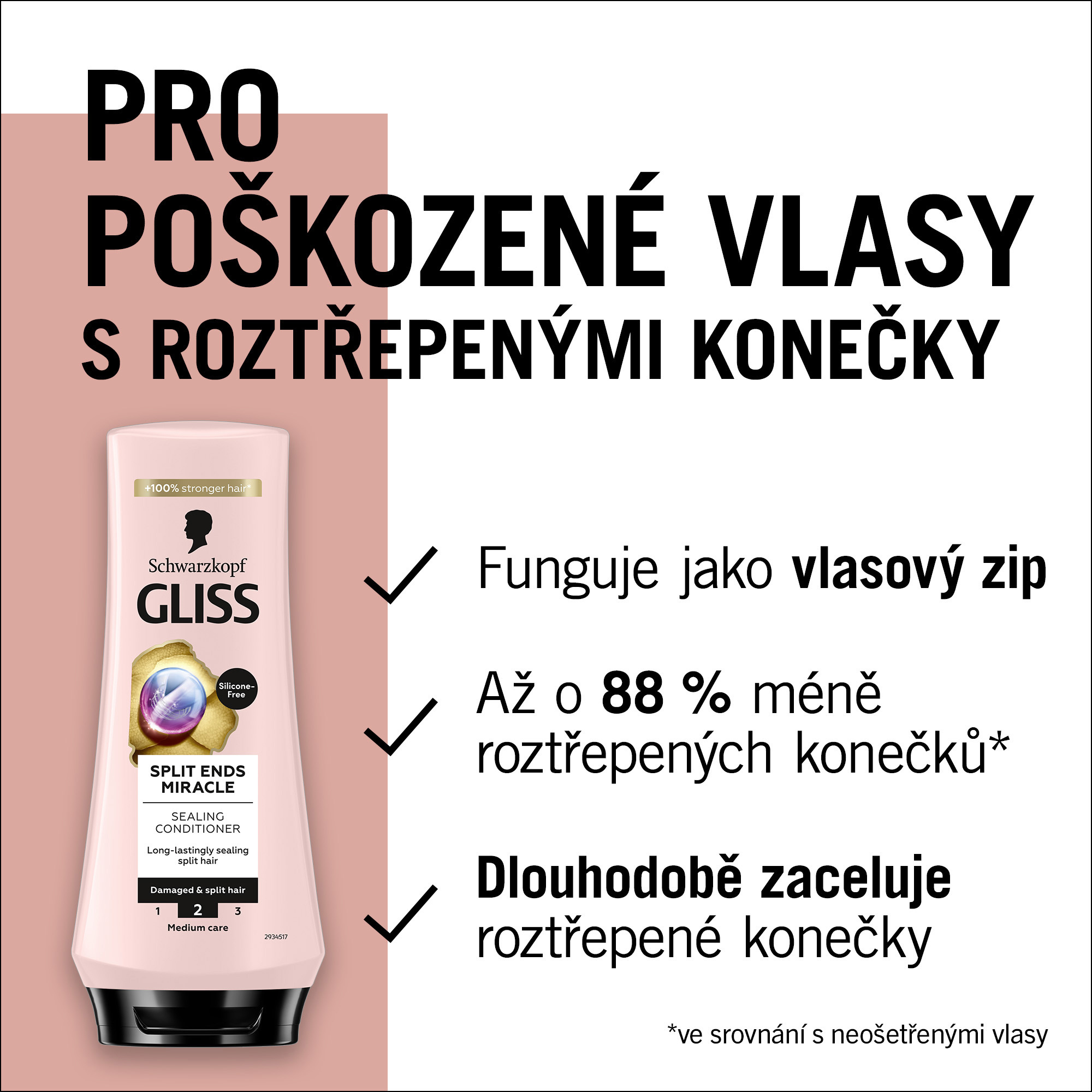 - Split Ends Miracle: Gliss zacelující kondicionér pro poškozené vlasy funguje jako vlasový zip; dlouhodobě zaceluje roztřepené vlasy - až o 88 % méně roztřepených konečků***.