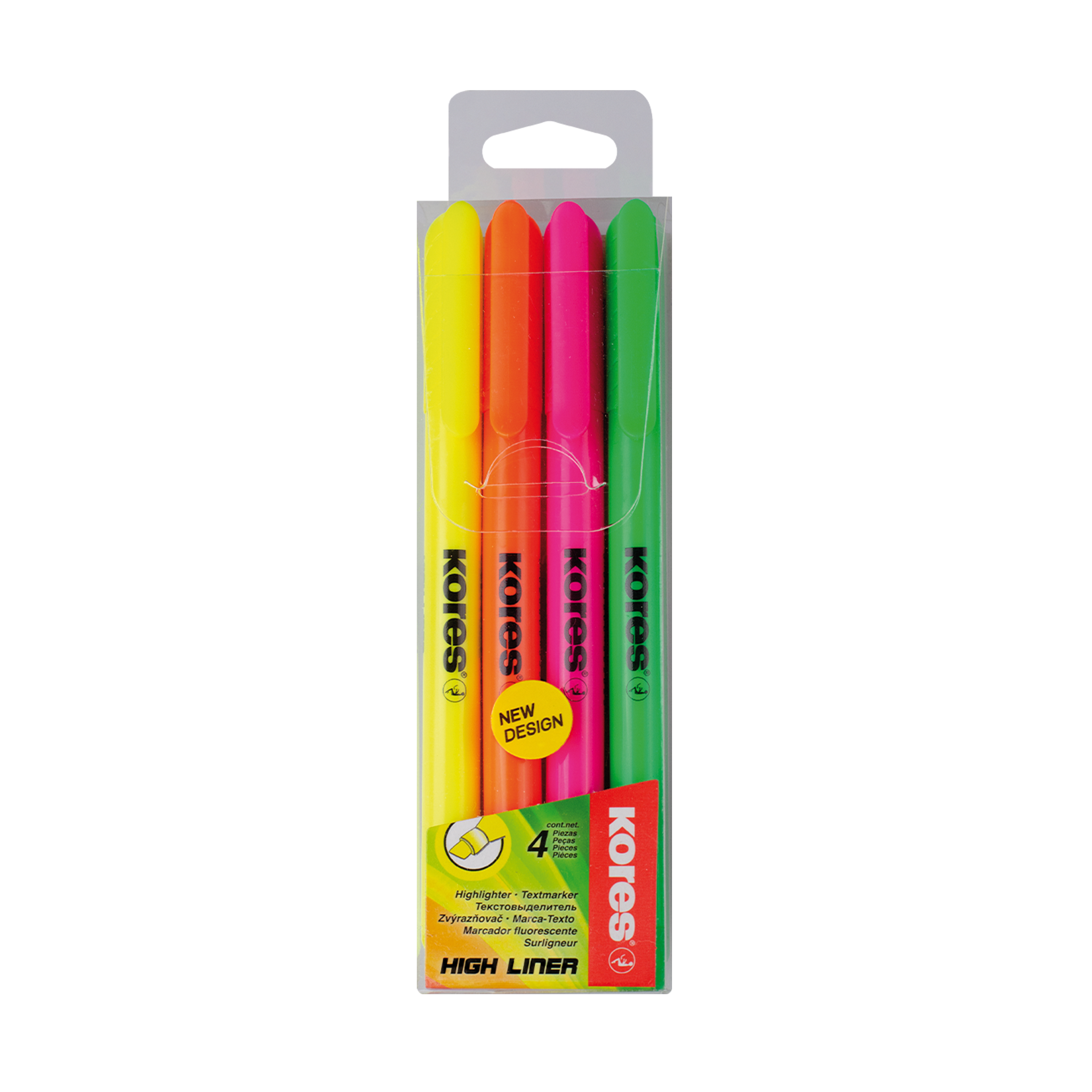 Zvýrazňovače Kores vysoké kvality se seříznutým hrotem o šíři 0,5-3,5 mm. Univerzální inkoust na vodní bázi pro všechny typy papíru, odolní proti UV záření, nevysychá ani při dlouhé době otevření, víčko a tělo v barvě inkoustu. Čtyři neonové barvy v balení – žlutý, oranžový, růžový a zelený zvýrazňovač. Vyrobeno v ČR.
