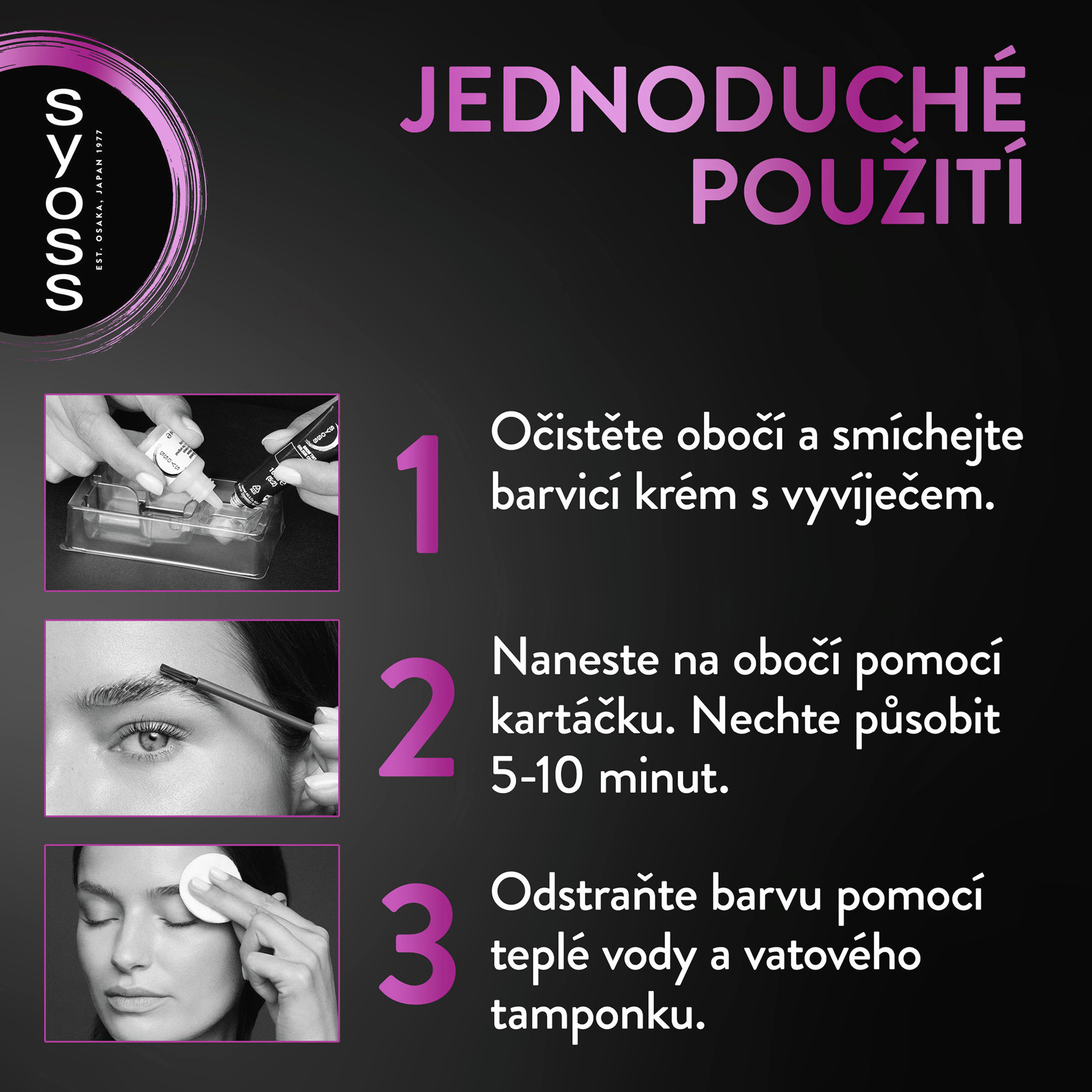 Vaše Wow obočí ve 4 jednoduchých krocích: Krok 1: Důkladně si očistěte obočí a pokožku kolem obočí chraňte nanesením vazelíny, abyste zabránili skvrnám. Krok 2: Vymáčkněte 1 g barvicího krému (1 dílek na tubě) do misky a smíchejte s 10 kapkami vyvíječe (0,4 g). A pomocí bílého štětce dobře promíchejte, dokud nevznikne homogenní směs. Krok 3: Naneste směs na obočí pomocí aplikačního štětce, dokud celé obočí nebude barvou dokonale pokryté, nechte působit 5-10 minut. Čím delší je doba působení, tím intenzivnější je barevný výsledek. Krok 4: Odstraňte barvu z obočí a pokožky pomocí teplé vody a vatového tamponu.