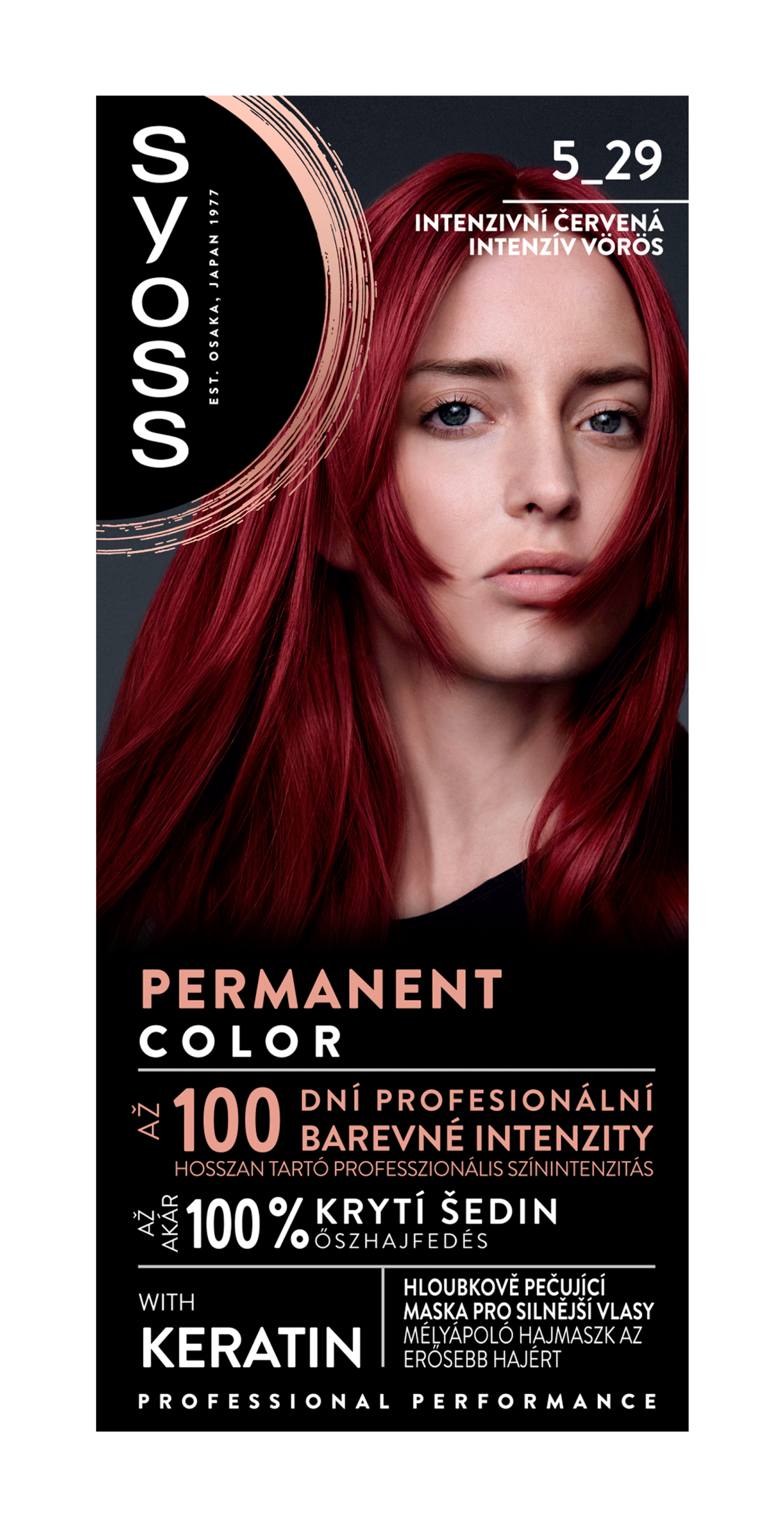 Permanentní barva na vlasy se 100% krytím šedin. Permanentní barvy na vlasy Syoss, s více než 45letou historií, jsou navrženy pro profesionální výkon. Vaše vlasy budou díky Syoss vypadat a působit plné života. Barvicí krém s bohatými barevnými pigmenty a keratinem proniká hluboko do vlasového vlákna a zajišťuje až 100 dní profesionální barevné intenzity a až 100% krytí šedin. Součástí balení je také hloubkově pečující maska obohacená o keratin, která hloubkově posiluje vlasy zevnitř a vyhlazuje jejich povrch. Pigmenty jsou uzamčeny ve vlasovém vlákně, což odhaluje nejživější a nejbohatší odstíny, které Syoss nabízí. Tato intenzivní červená barva na vlasy se doporučuje pro tmavě blond až středně hnědé vlasy.