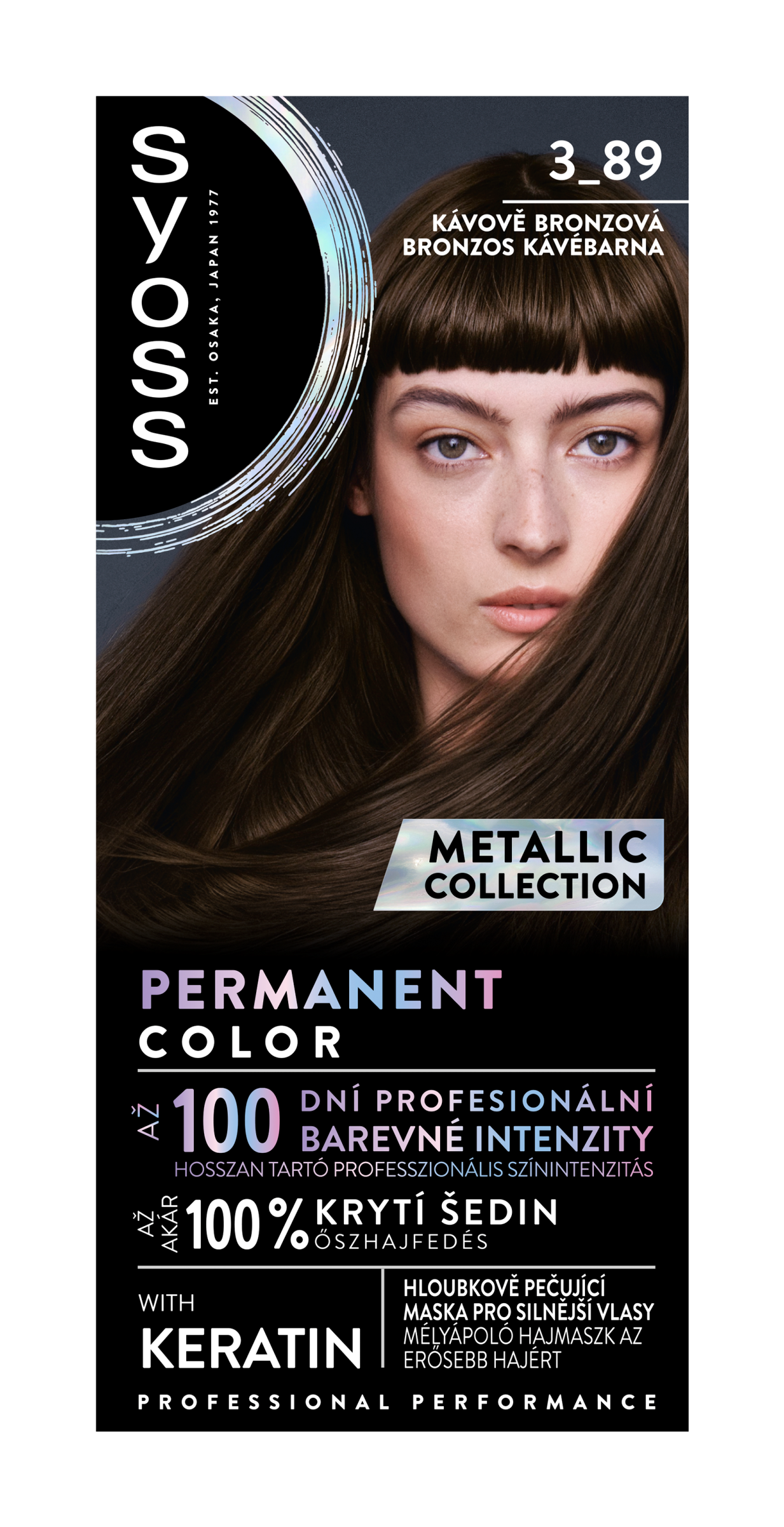 Permanentní barva na vlasy se zářivým metalickým vzhledem a s až 100% krytím šedin Permanentní barvy na vlasy Syoss, s více než 45letou historií, jsou navrženy pro profesionální výkon. Tato metalická barva na vlasy je inspirována nejnovějšími módními trendy a vaše vlasy budou díky ní vypadat a působit plné života po dlouhou dobu se zářivým metalickým vzhledem. Barvicí krém s bohatými barevnými pigmenty a keratinem proniká hluboko do vlasového vlákna a zajišťuje až 100 dní profesionální barevné intenzity a až 100% krytí šedin. Součástí balení je také hloubkově pečující maska obohacená o keratin, která hloubkově posiluje vlasy zevnitř a vyhlazuje jejich povrch. Pigmenty jsou uzamčeny ve vlasovém vlákně, což odhaluje nejživější a nejbohatší odstíny, které Syoss nabízí. Tato kávově bronzová barva na vlasy se doporučuje pro středně hnědé až černohnědé vlasy.