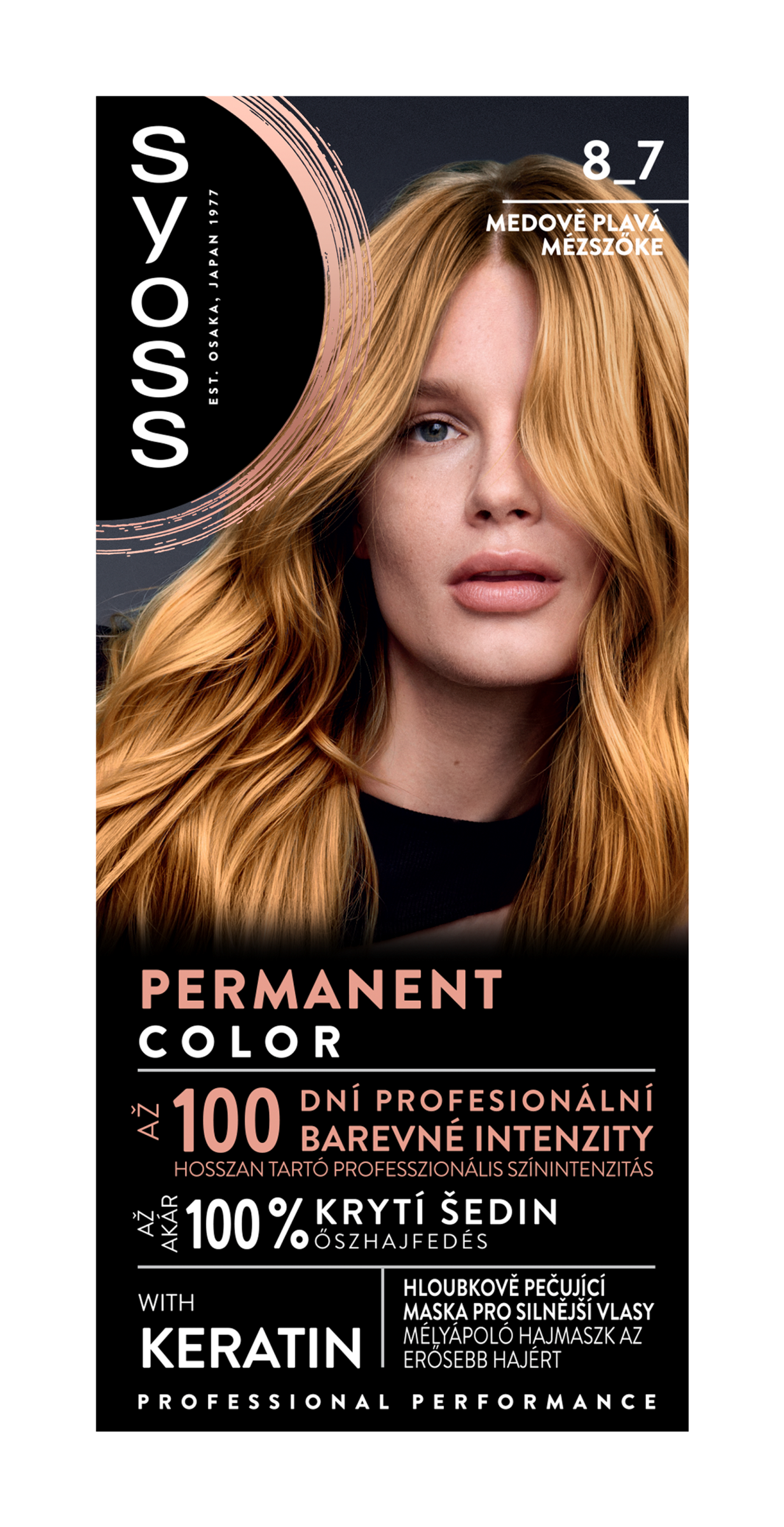 Permanentní barva na vlasy Syoss Color 8-7 Medově plavá - Permanentní barva na vlasy s až 100% krytím šedin Permanentní barvy na vlasy Syoss, s více než 45letou historií, jsou navrženy pro profesionální výkon. Vaše vlasy budou díky Syoss vypadat a působit plné života. Barvicí krém s bohatými barevnými pigmenty a keratinem proniká hluboko do vlasového vlákna a zajišťuje až 100 dní profesionální barevné intenzity a až 100% krytí šedin. Součástí balení je také hloubkově pečující maska obohacená o keratin, která hloubkově posiluje vlasy zevnitř a vyhlazuje jejich povrch. Pigmenty jsou uzamčeny ve vlasovém vlákně, což odhaluje nejživější a nejbohatší odstíny, které Syoss nabízí. Tato medově plavá barva na vlasy se doporučuje pro světle blond až středně blond vlasy.