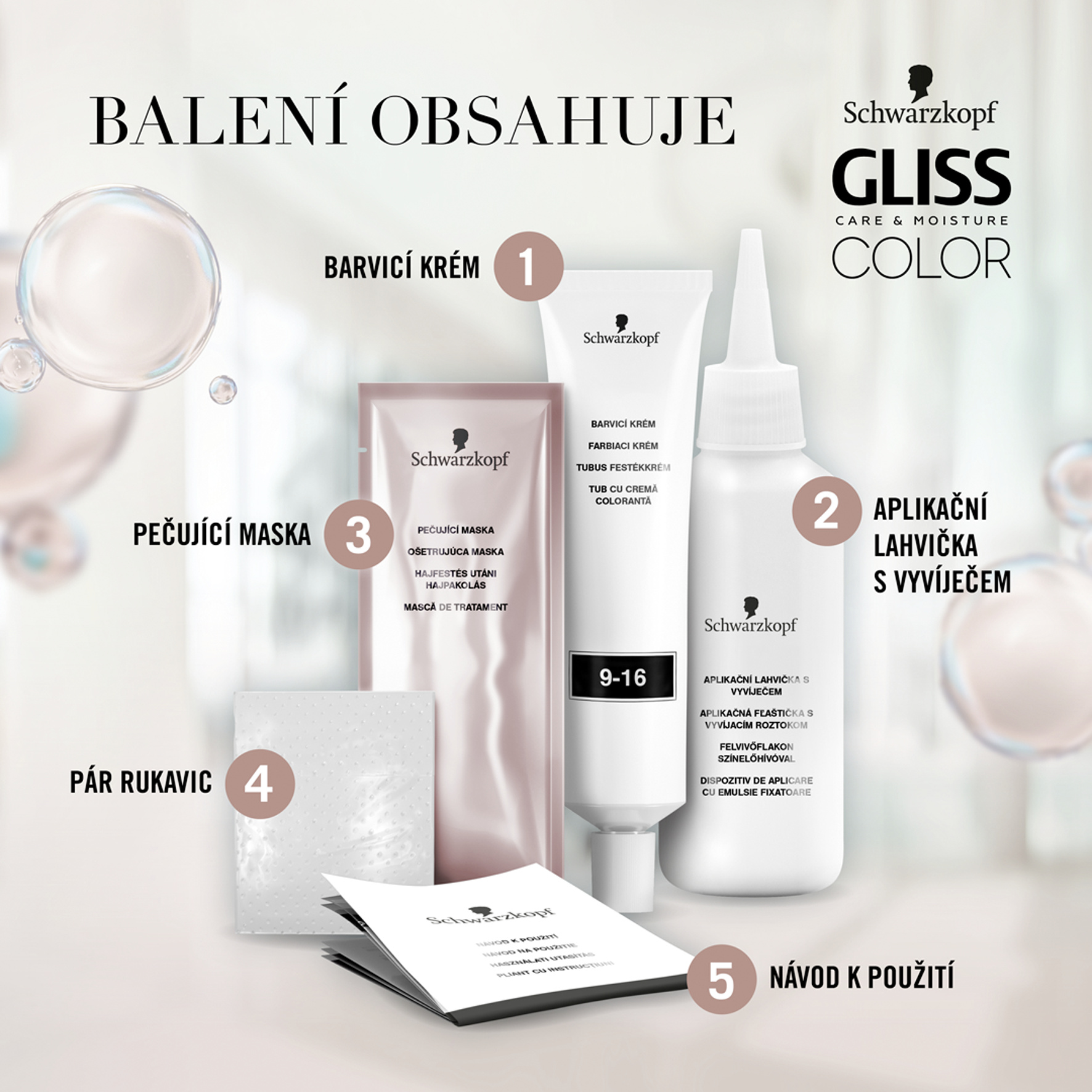 Vyvíječ: aqua (water, eau), hydrogen peroxide, cetearyl alcohol, propylene glycol, ceteareth-20, steartrimonium chloride, paraffinum liquidum (mineral oil, huile minérale), etidronic acid, 2,6-dicarboxypyridine, disodium pyrophosphate, potassium hydroxide, isopropyl alcohol, sodium benzoate