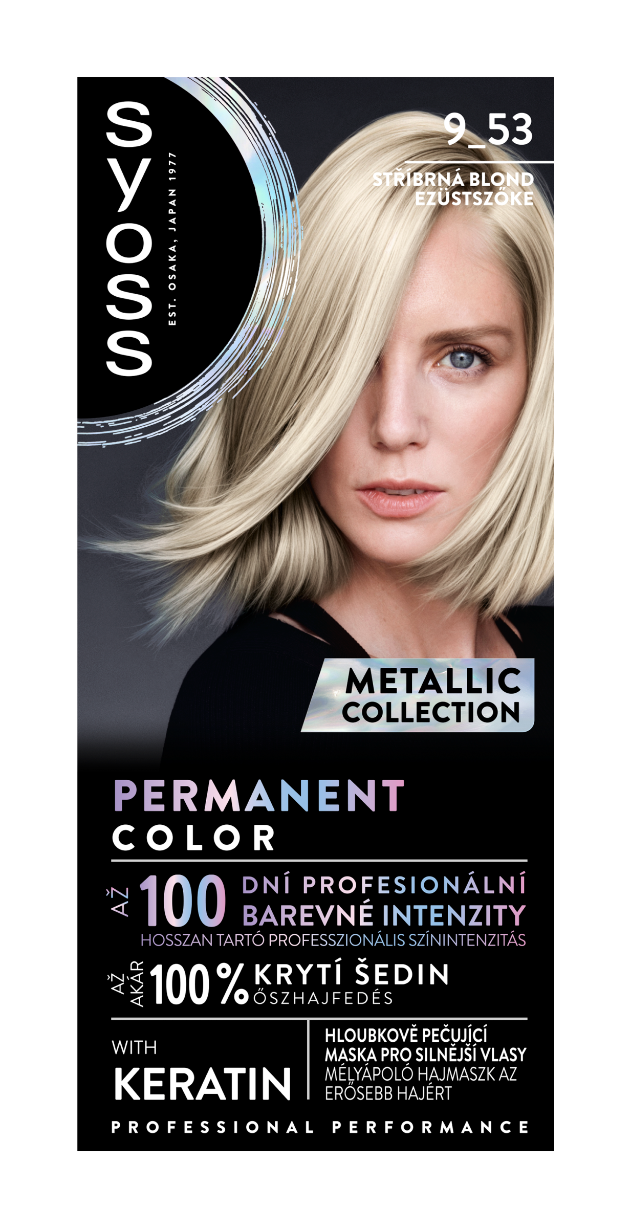 Permanentní barva na vlasy se zářivým metalickým vzhledem a s až 100% krytím šedin Permanentní barvy na vlasy Syoss, s více než 45letou historií, jsou navrženy pro profesionální výkon. Tato metalická barva na vlasy je inspirována nejnovějšími módními trendy a vaše vlasy budou díky ní vypadat a působit plné života po dlouhou dobu se zářivým metalickým vzhledem. Barvicí krém s bohatými barevnými pigmenty a keratinem proniká hluboko do vlasového vlákna a zajišťuje až 100 dní profesionální barevné intenzity a až 100% krytí šedin. Součástí balení je také hloubkově pečující maska obohacená o keratin, která hloubkově posiluje vlasy zevnitř a vyhlazuje jejich povrch. Pigmenty jsou uzamčeny ve vlasovém vlákně, což odhaluje nejživější a nejbohatší odstíny, které Syoss nabízí. Tato stříbrná blond barva na vlasy se doporučuje pro světle blond až středně blond vlasy.
