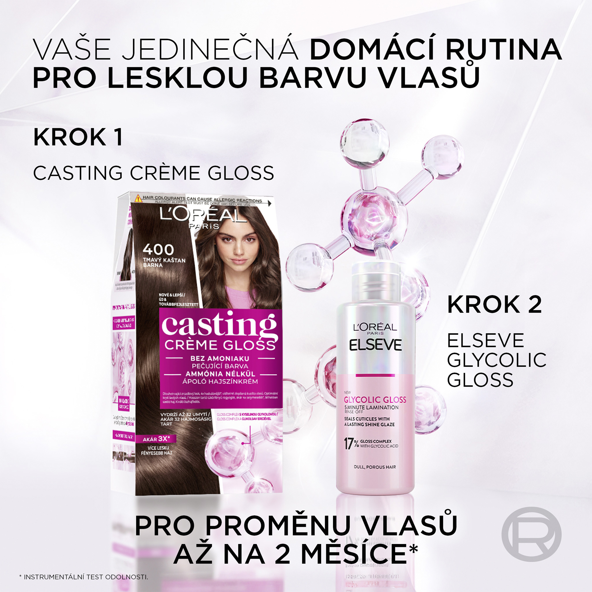 VAROVNÝ TEST NA ALERGII musí být proveden 48 HODIN před každou aplikací tohoto produktu, neboť alergie se může rozvinout náhle i po předcházející bezproblémové aplikaci tohoto nebo jiného přípravku k barvení vlasů. Nezapomeňte si koupit barvu na vlasy se 48 hodinovým předstihem (Postupujte podle instrukcí v příbalovém letáku). V případě jakékoli reakce nebo pochyb konzultujte s lékařem před opětovným barvením jakýmkoli produktem. Oxidační činidlo obsahuje: peroxid vodíku. Používejte vhodné rukavice, které jsou součástí produktu. Vyhněte se kontaktu produktu s očima, ušima a obličejem. Nepoužívejte k barvení řas a obočí. Při zasažení očí okamžitě vypláchněte důkladně vodou. Po aplikaci produktů vlasy důkladně opláchněte. Po trvalé nebo dlouhodobém narovnávání vlasů vyčkejte minimálně 2 týdny před aplikací produktu. Nepoužívejte na vlasy barvené hennou a přímými barvami. Uchovávejte mimo dosah dětí.