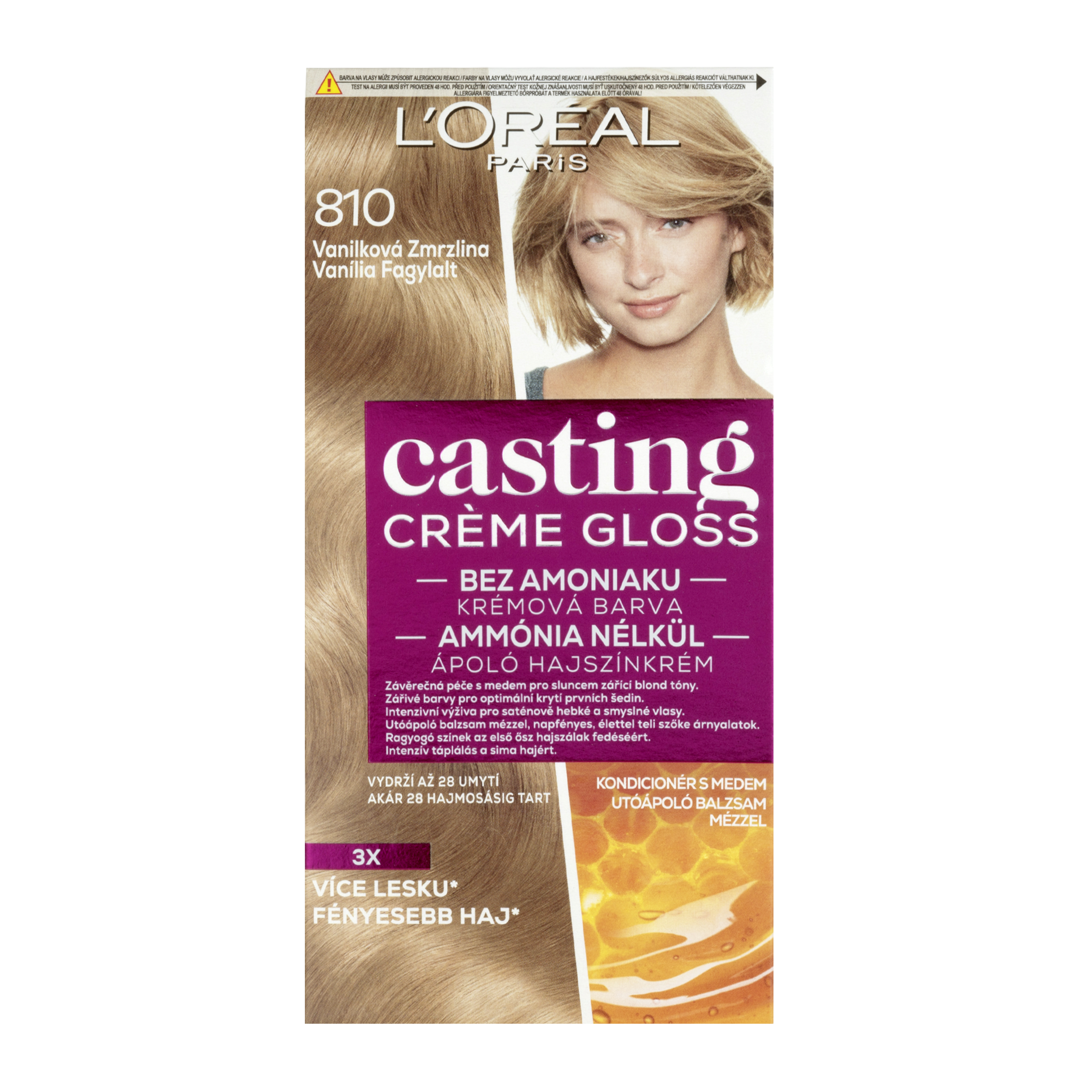L'Oréal Paris Casting Crème Gloss barva na vlasy je postupně se vymývající barva bez amoniaku, která zanechá vaše vlasy zdravé a plné bohatých odlesků. Krémové složení barvy se snadno nanáší, při aplikaci nestéká a lehká ovocná vůně zaručí příjemný zážitek z barvení. Závěrečná péče obohacená o mateří kašičku, známou svými regeneračními vlastnostmi, pečuje o vlasy po barvení.