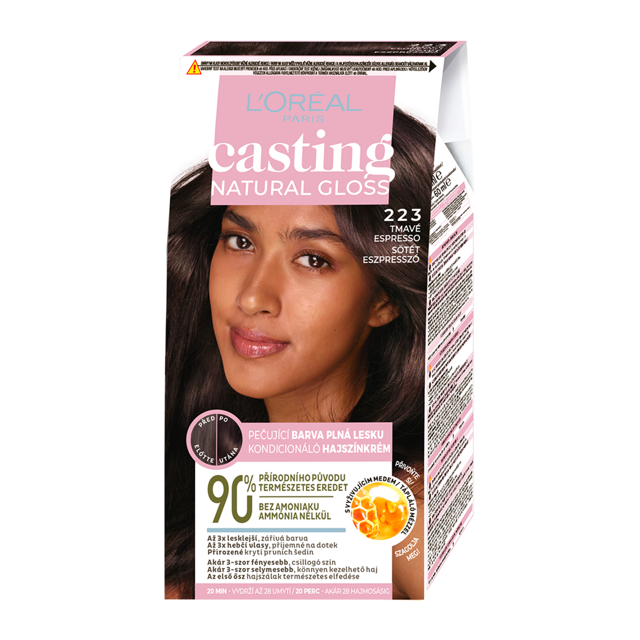 Casting Natural Gloss od L'oreal Paris má z 90 % přírodní složení, které přirozeně kryje první šediny. Pečuje o každý pramen a vyhlazuje ho, navíc zanechává vlasy až 3x lesklejší a hebčí. Barvy jsou vyvinuty pro všechny typy vlasů. Barva se postupně vymývá až k vašemu přirozenému odstínu po dobu 28 umytí.