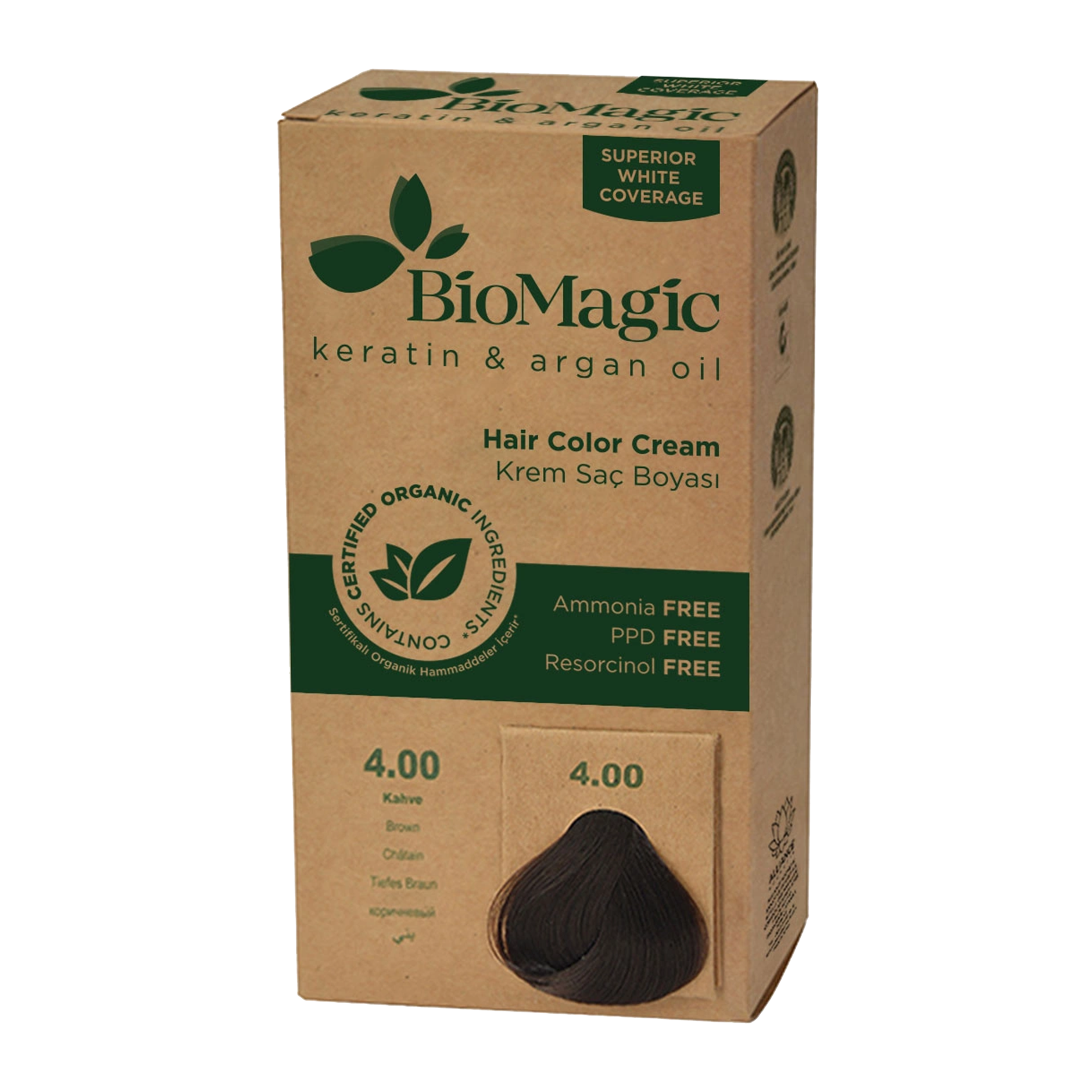 Objevte sílu přírody s BioMagic 4.00 Brown. Naše barva na vlasy, obohacená o keratin, arganový olej a heliogenolový extrakt, hýčká vaše vlasy a pokožku hlavy. Díky organickému složení dodá vašim vlasům přirozený odstín a zářivý lesk. Její jemná formule je ideální pro citlivou pokožku a zaručuje pohodlné barvení.