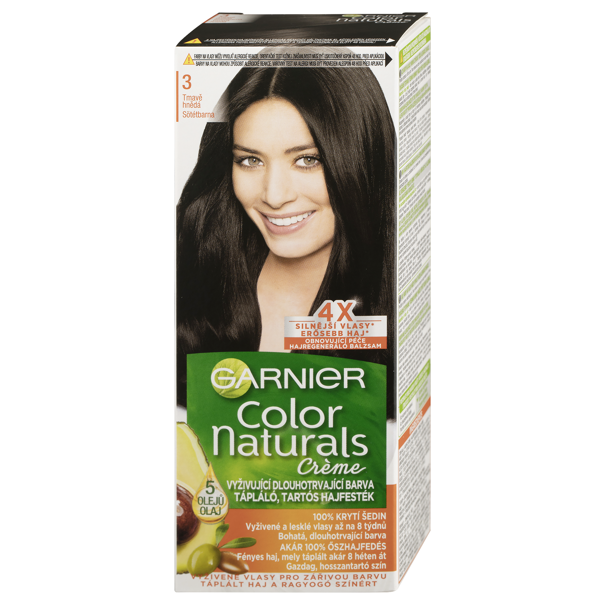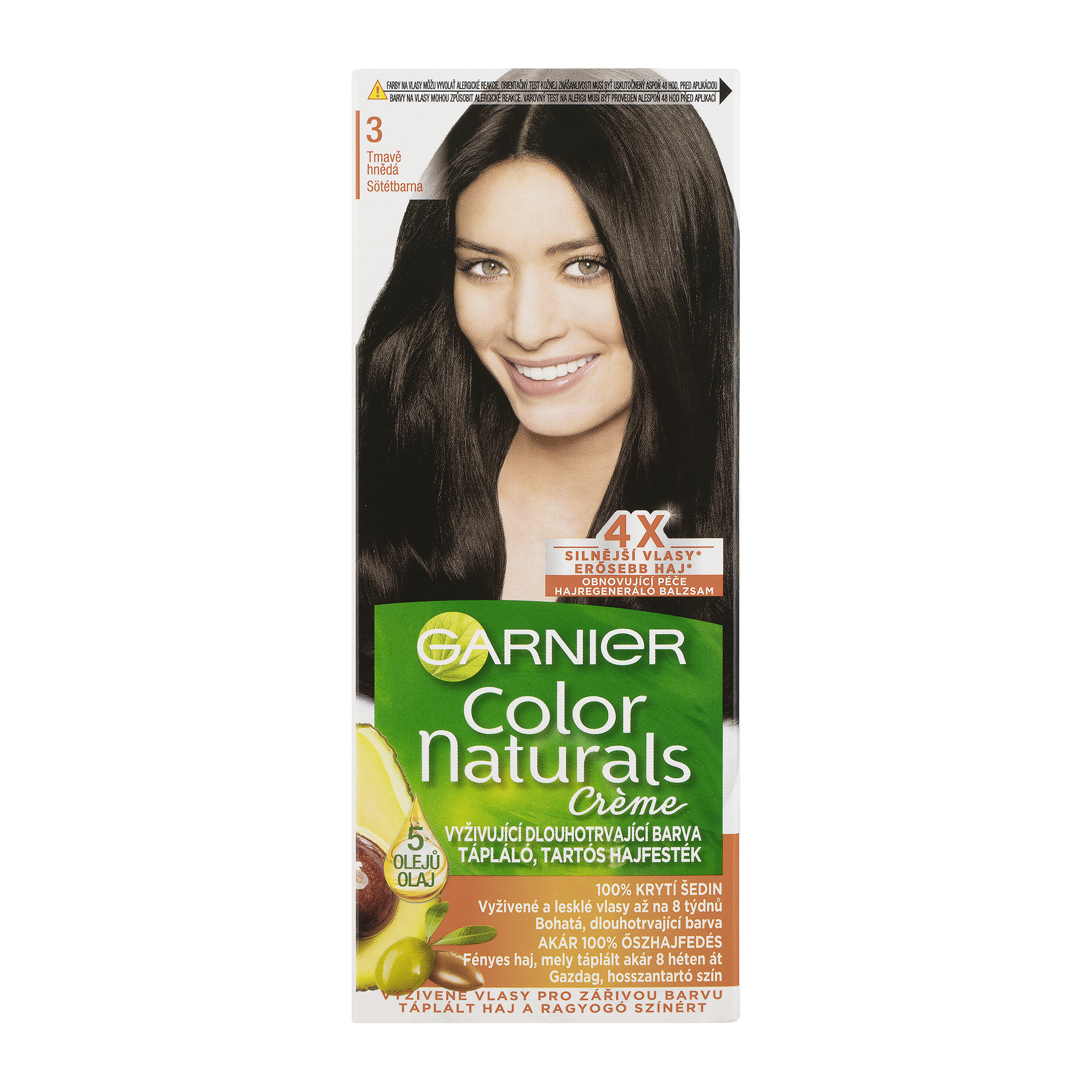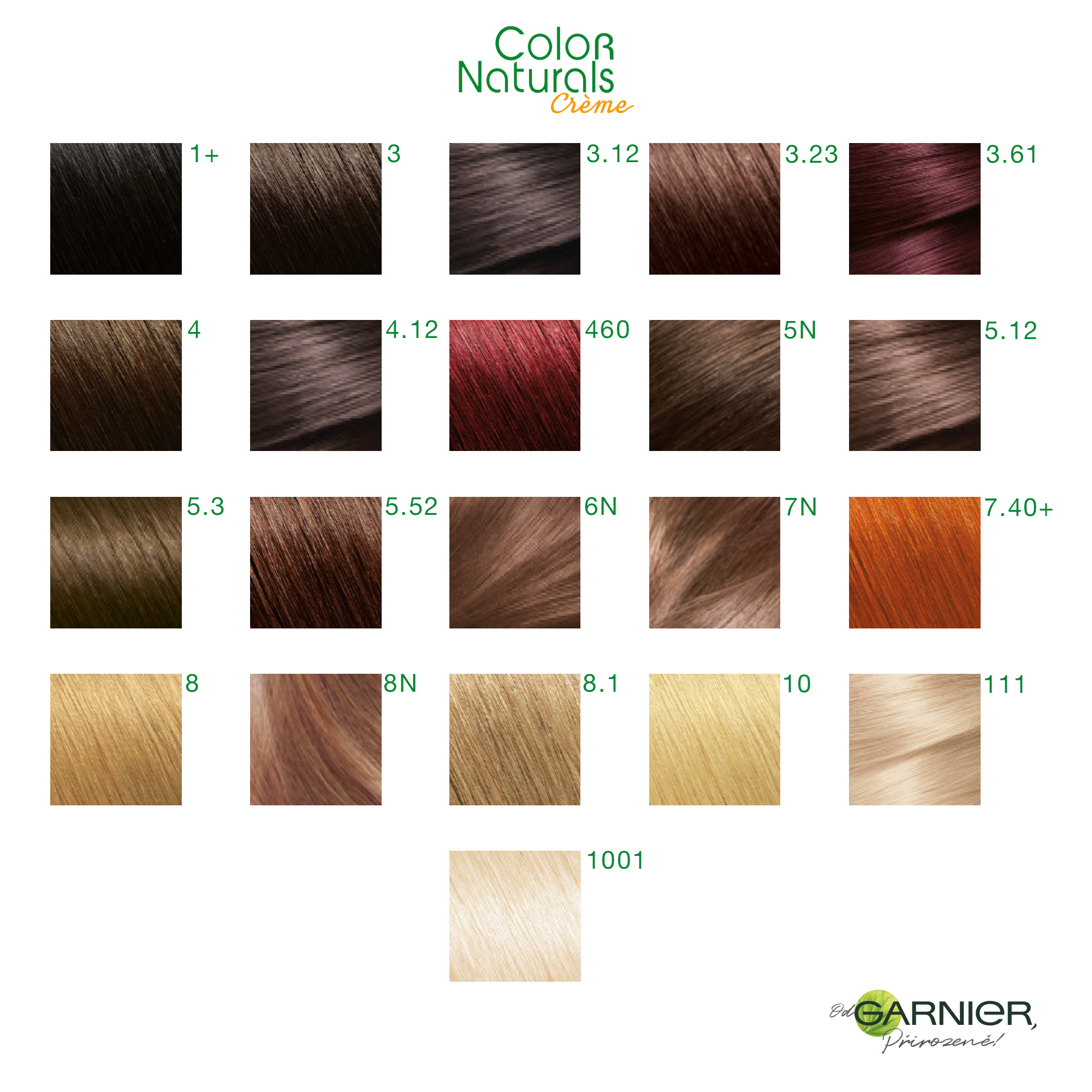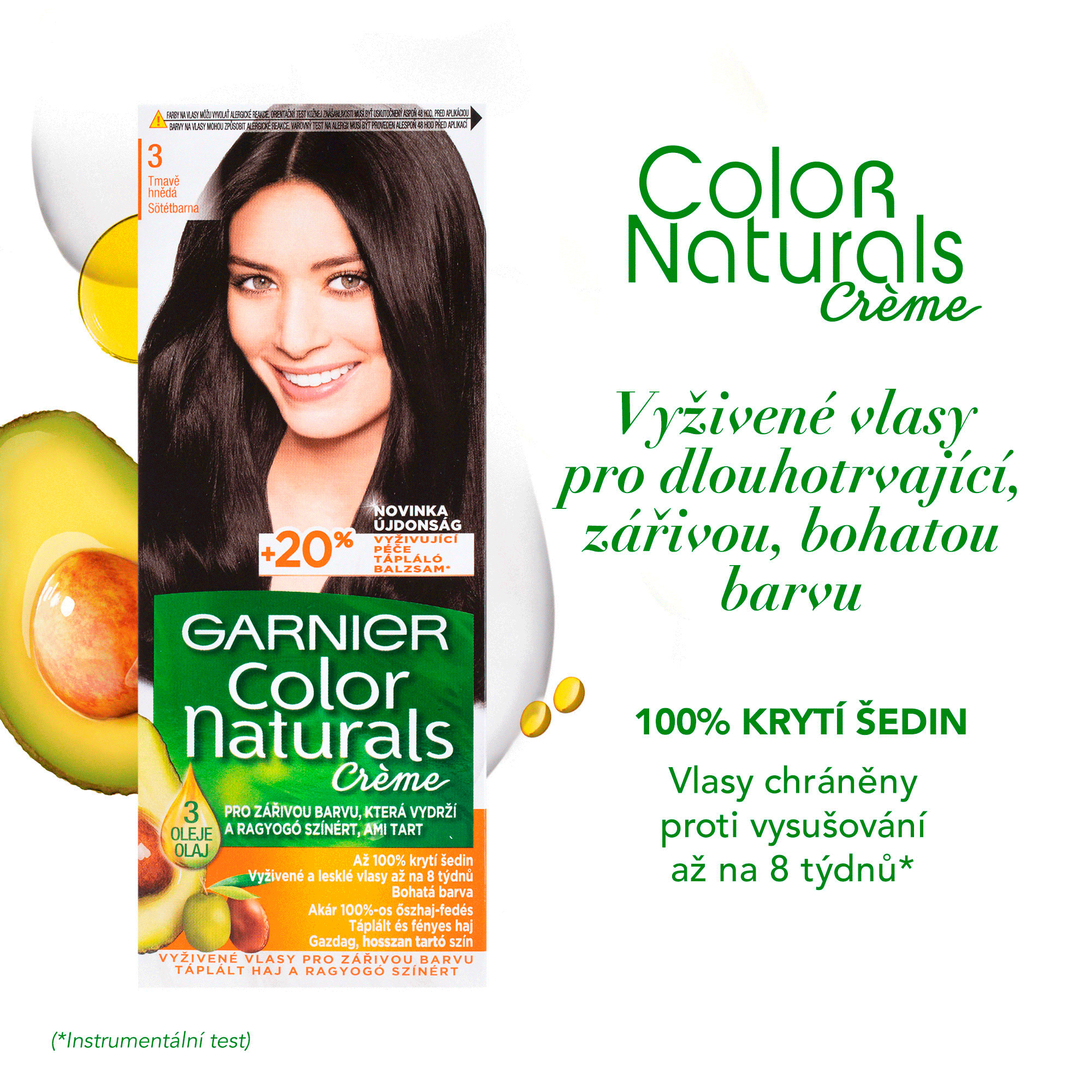 Barva na vlasy Garnier Color Naturals je vyživující permanentní barvou od Garnier. Díky složení vyživující péče obohacené o 5 olejů – olivy, avokádo, karité, kokos a argan budou vaše vlase lesklejší a hebčí. Péče intenzivně vyživuje vlasy, uhlazuje povrch vlasového vlákna a vytváří ochrannou vrstvu. Technologie „Color boost“ pro sytější a déle trvající barvu proniká do vlasových vláken a vyplňuje je sytou bohatou barvou. Díky závěrečné péči s 5 oleji je barva bohatá a dlouhotrvající. Výsledkem jsou 5x silnější vlasy, 100% krytí šedin a ochrana vlasů před vysušováním až na 8 týdnů, (*Instrumentální test). Zesvětlující barvy dokáží přirozeně odbarvit vlasy až o 4 odstíny. Studené pigmenty obsažené ve vybraných studených odstínech eliminují nežádoucí oranžové a žluté odlesky.