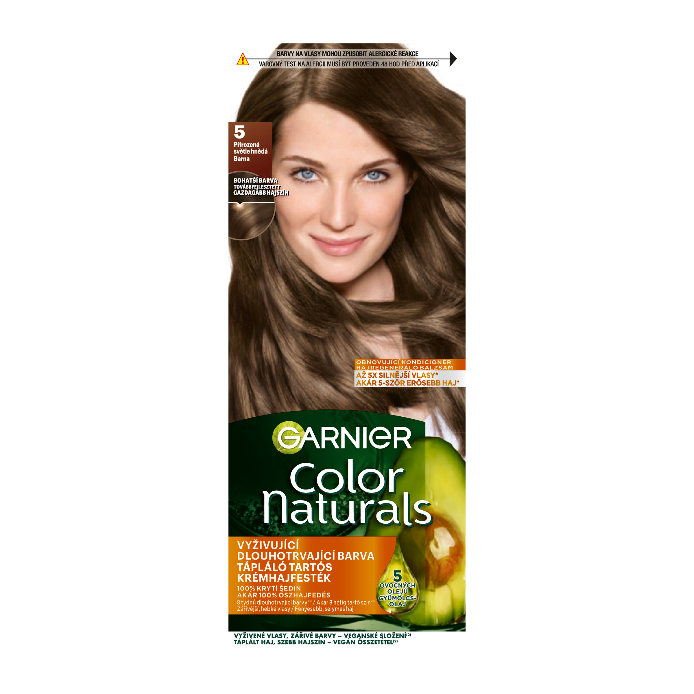Barva na vlasy Garnier Color Naturals je vyživující permanentní barvou od Garnier. Díky složení vyživující péče obohacené o 5 olejů – olivy, avokádo, karité, kokos a argan budou vaše vlase lesklejší a hebčí. Péče intenzivně vyživuje vlasy, uhlazuje povrch vlasového vlákna a vytváří ochrannou vrstvu. Technologie „Color boost“ pro sytější a déle trvající barvu proniká do vlasových vláken a vyplňuje je sytou bohatou barvou. Díky závěrečné péči s 5 oleji je barva bohatá a dlouhotrvající. Výsledkem jsou 5x silnější vlasy, 100% krytí šedin a ochrana vlasů před vysušováním až na 8 týdnů, (*Instrumentální test). Zesvětlující barvy dokáží přirozeně odbarvit vlasy až o 4 odstíny. Studené pigmenty obsažené ve vybraných studených odstínech eliminují nežádoucí oranžové a žluté odlesky.
